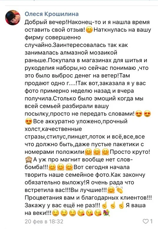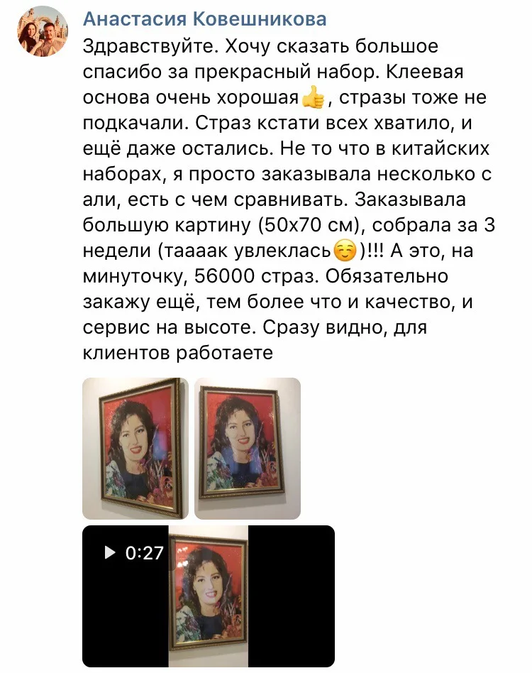 Дорогие покупатели! Наша компания существует уже больше 5 лет, мы нацелены на лучшее качество алмазной мозаики по фотографии будем рады предоставить для вас отличный сервис!