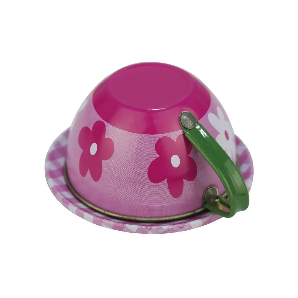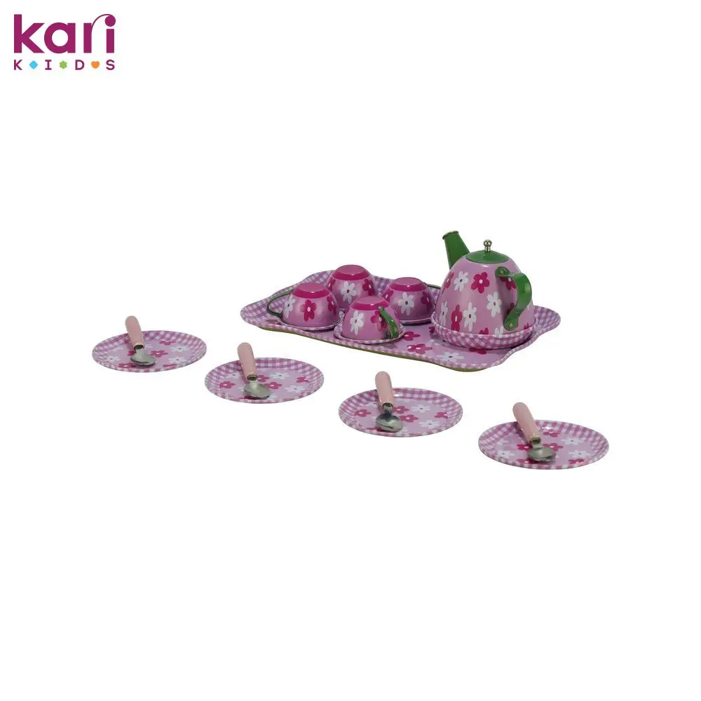 Игрушечный чайный сервиз от kari KIDS состоит из предметов небольшого размера, которые можно удобно разместить на детском столике. Посуда изготовлена из металла розового цвета с цветочным рисунком и геометрическим, есть несколько керамических элементов.