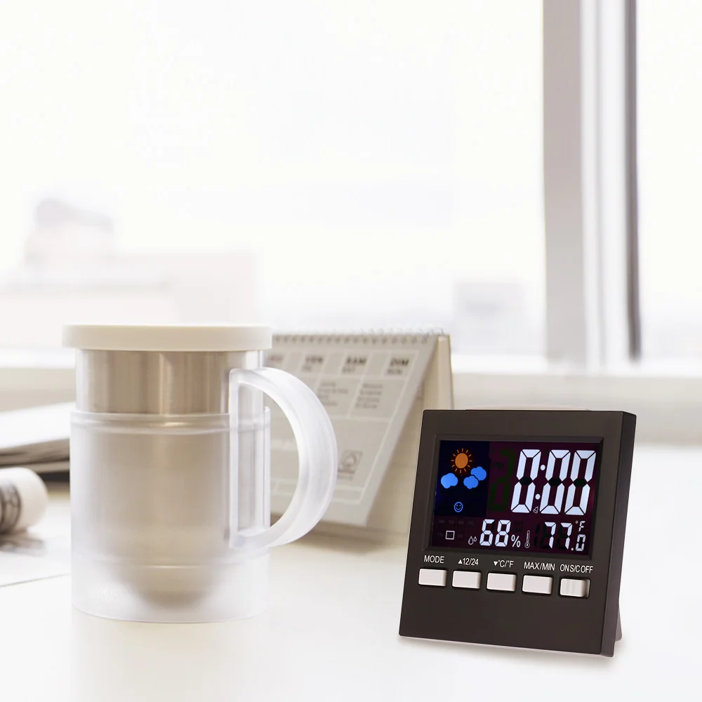 Особенности -Отображение времени, даты, недели и измерения температуры и влажности. -Отображение максимальной и минимальной температуры и влажности. -Прогноз погоды: солнечный, частично солнечный, облачный, дождливый и дождливый. -°C / °F блок температуры опционально. -Отображение времени 12/24 часов по желанию. -Цветной ЖК-дисплей с подсветкой. -Функция управления звуком: когда срабатывает сигнализация или издает звук, светодиодный светильник будет включаться. -Функция Sense светильник: задний светильник автоматически включается в темноте через «ON/C OFF». -Он также имеет функции будильника и повтора.