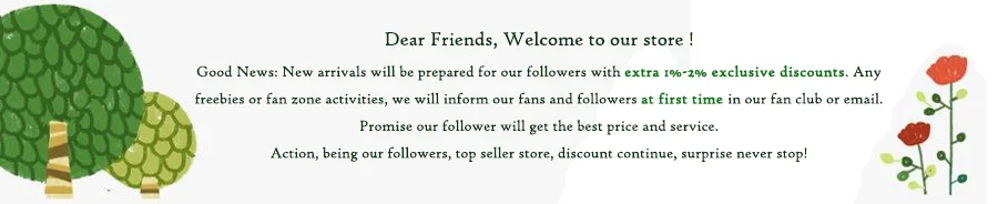 Дорогие друзья, добро пожаловать в наш магазин! Хорошие новости: Новые поступления будут подготовлены для наших подписчиков с дополнительными 1%-2% эксклюзивными скидками. Любые Бесплатные действия или действия в зоне фанатов, мы сообщим нашим поклонникам и последователям в наш фан-клуб или по электронной почте. Обещаем, что наш последователь получит лучшую цену и сервис. Действие, быть нашими последователями, магазин лучших продавцов, скидки продолжаются, сюрприз никогда не останавливается!