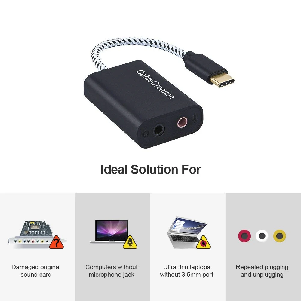 ♥Кабель USB-C аудио адаптер является идеальной альтернативой для обхода поврежденной звуковой карты. Он обеспечивает решение для подключения существующих гарнитур, затычек для ушей, динамиков, микрофонов и aux кабелей к USB-C оборудованному компьютеру и мобильному телефону.