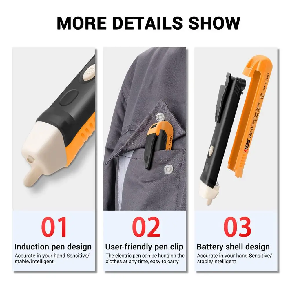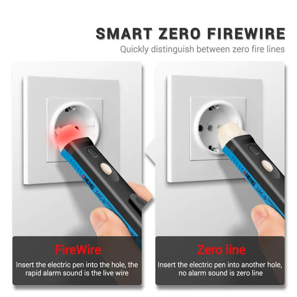 Простота в использовании: просто прикоснитесь к наконечнику к клеммной полосе, розетке или шнуру питания. Когда наконечник светится красным, и устройство загорится, вы знаете, что присутствует напряжение.