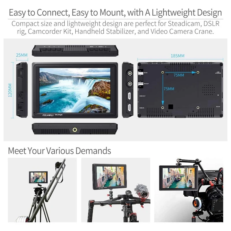 [Легкий дизайн, легко монтируется] компактный размер и легкий дизайн 365g идеально подходят для Steadicam, DSLR rig, камкордера, ручного стабилизатора и крана видеокамеры. VESA 75 монтажных отверстий Установите в задней части, чтобы прикрепить монитор к прочному креплению при необходимости.