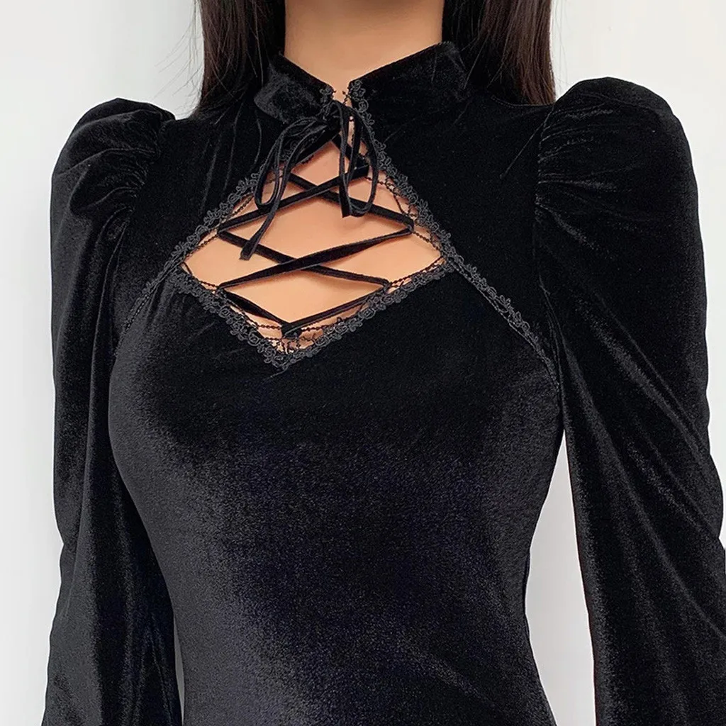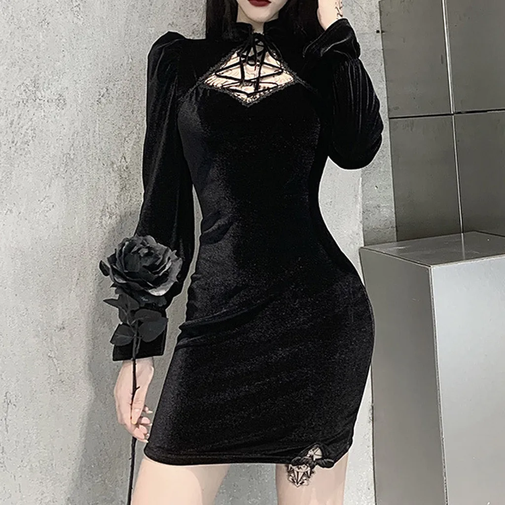 Женское готическое платье с высоким воротником, лоскутное Бандажное платье в готическом стиле