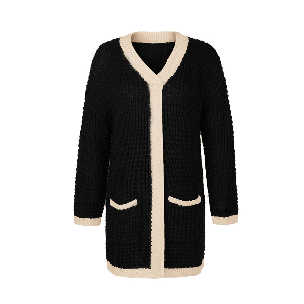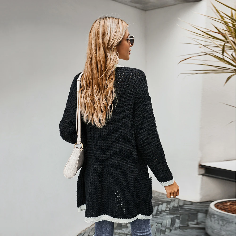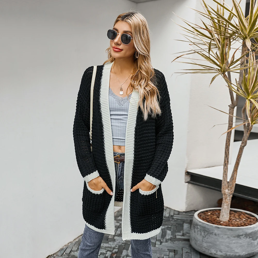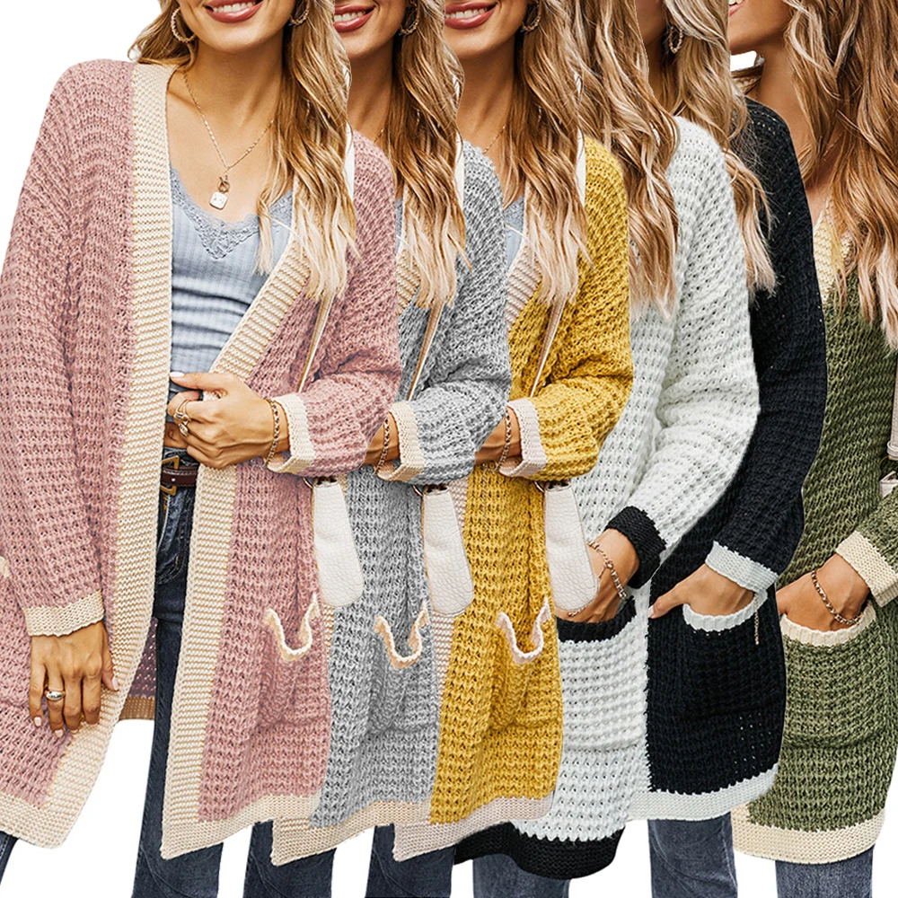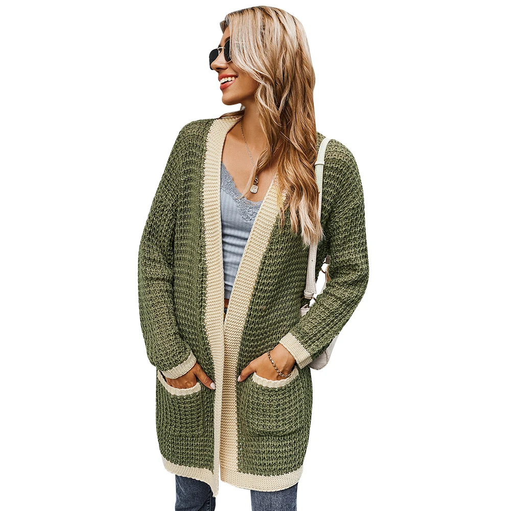 Женский кардиган с карманами и длинным рукавом, Открытый спереди, повседневный вязаный свитер, пальто