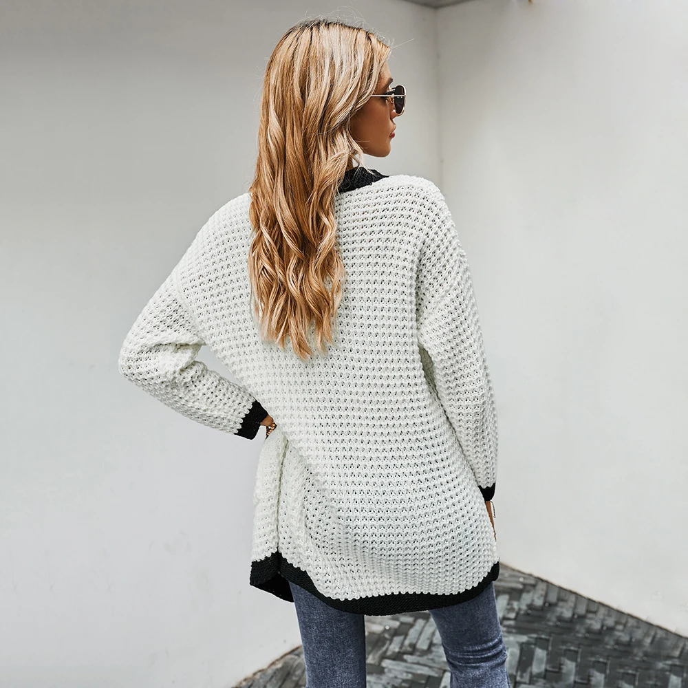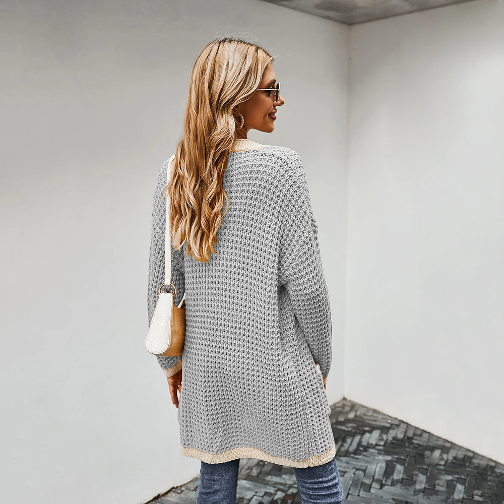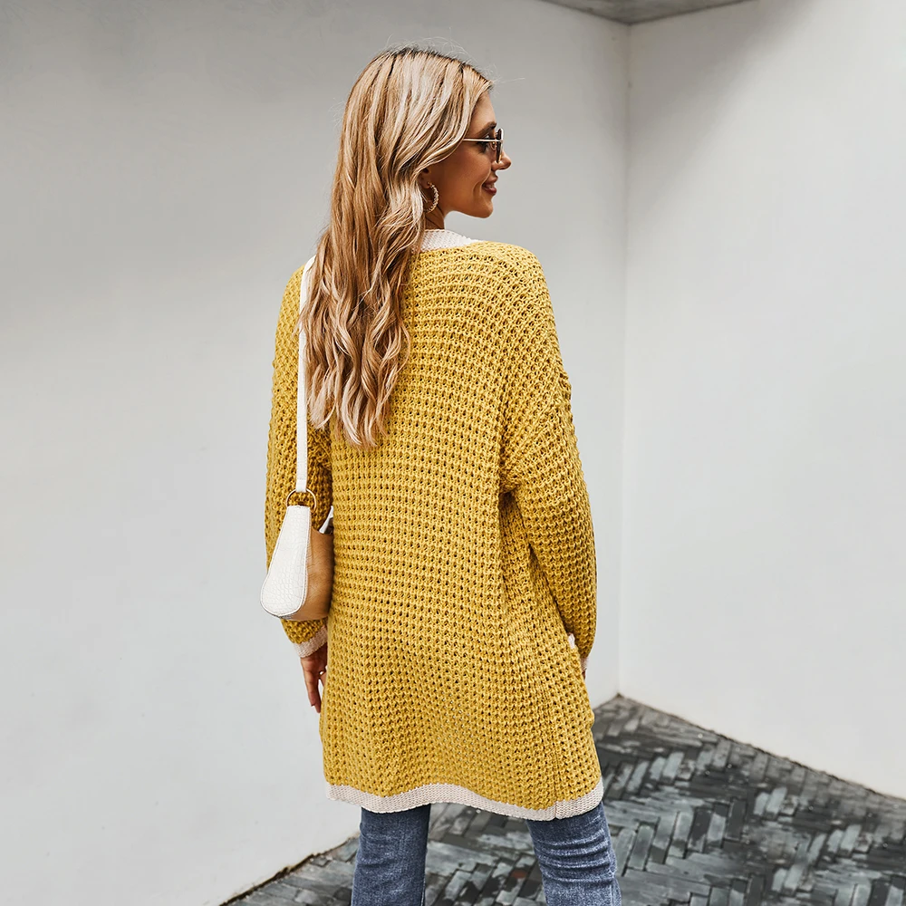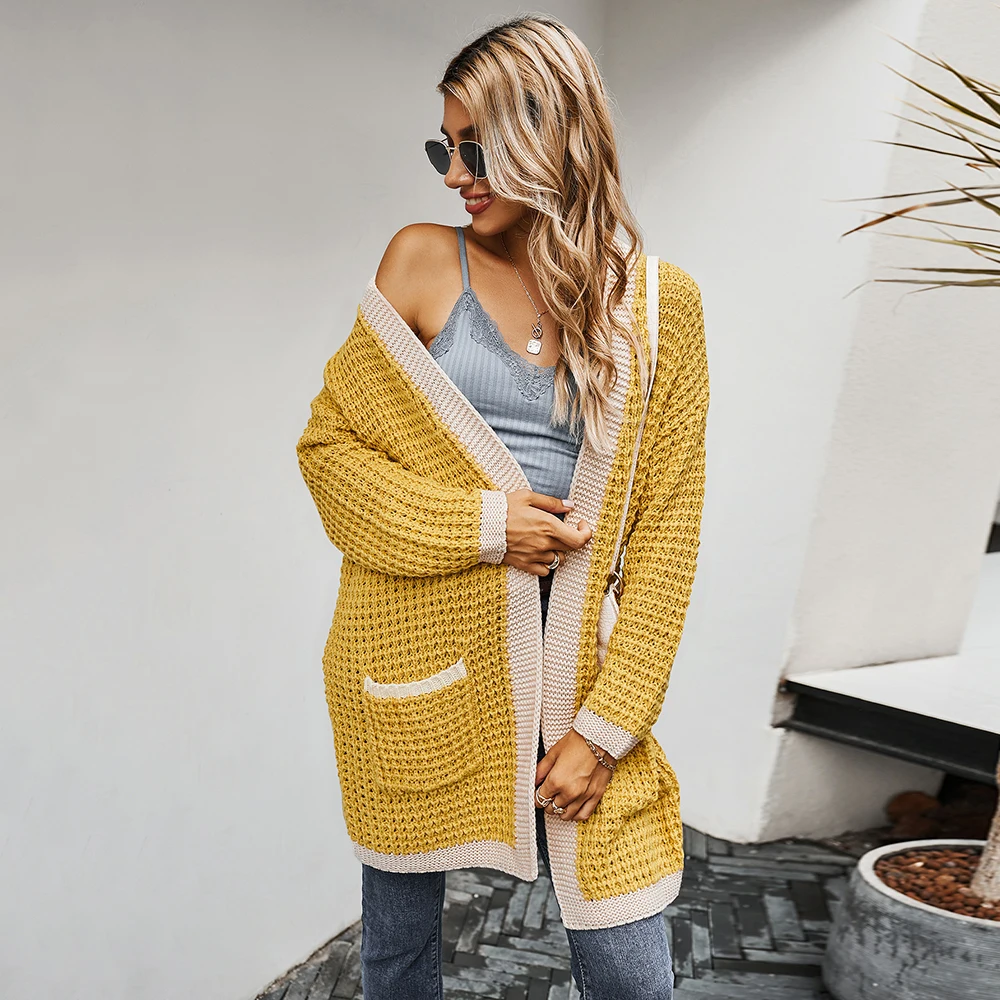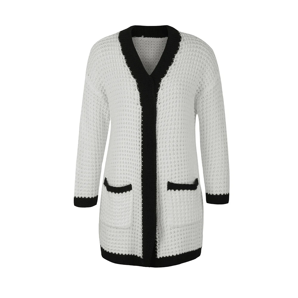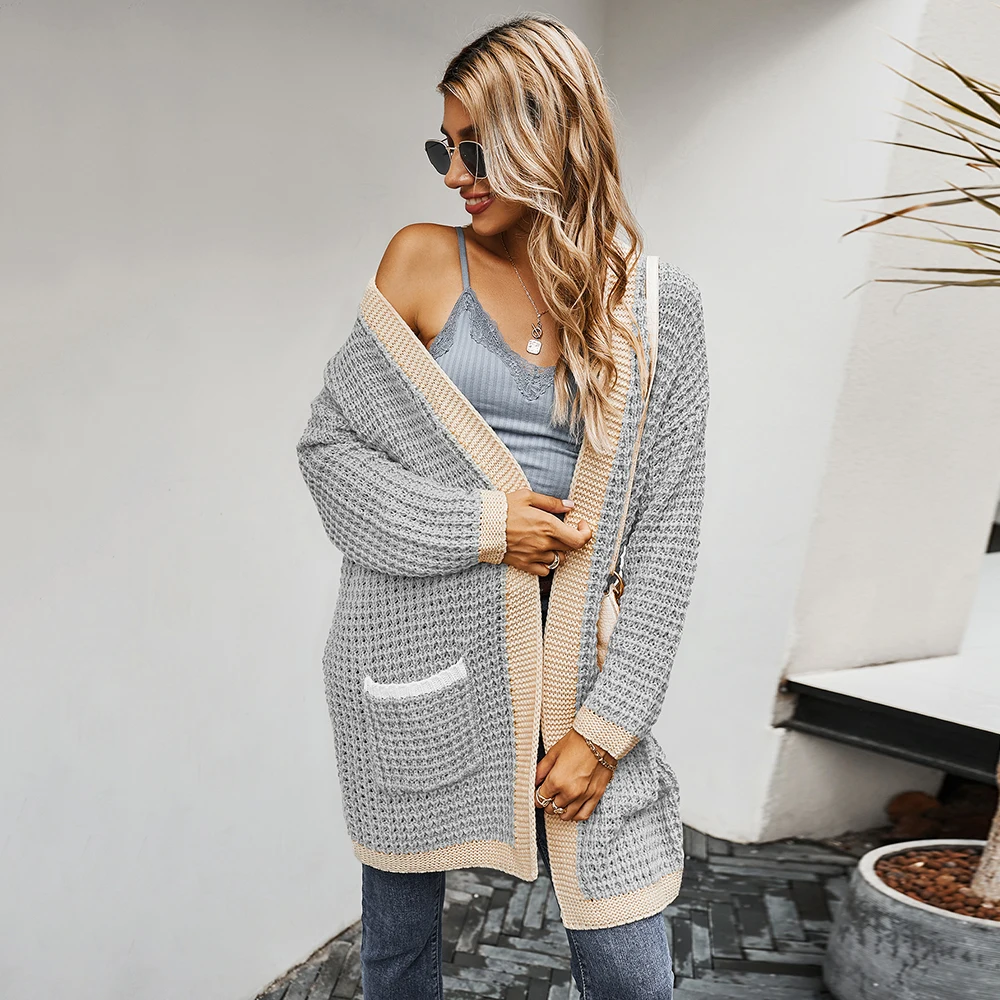 Женский кардиган с карманами и длинным рукавом, Открытый спереди, повседневный вязаный свитер, пальто