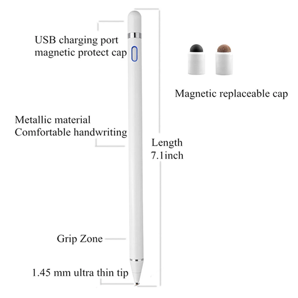 Спецификация: Функция: покраска, написание, заметки, касание Время зарядки: 1 ч Время работы: 8-10 ч Совместимость: для телефонов Android/Apple, все бренды емкостных экранных устройств с плоским экраном Материал: алюминиевый корпус (наконечник из чистой меди, наконечник ручки с защитной пленкой, которая не повреждает экран). Эффективное расстояние: 1,6 мм из-под пера Стандартные аксессуары: зарядное устройство USB Батарея Технические характеристики: 0,518 W, 3,7 V, 140 мА · ч. Цвет изделия: черный, белый (больше пользовательских цветов s) Размер: диаметр ручки 9 мм X общая длина 175 мм/0,35X6,89" Светильник: Нажмите кнопку один раз, синий светодиодный светильник включен, вы можете использовать его. Нажмите кнопку снова, выключите светильник, светодиодный светильник выключается. Красный светодиодный светильник включается при зарядке, светильник выключается или зеленый светильник включается при полной зарядке аккумулятора. Примечание: 1. Из-за различных настроек монитора и светильник эффект, фактический цвет элемента может быть s светильник ly отличается от цвета, представленного на снимках. Спасибо! 2. Возможны отклонения в 1-3 мм вследствие измерений вручную. 1 X зарядный кабель