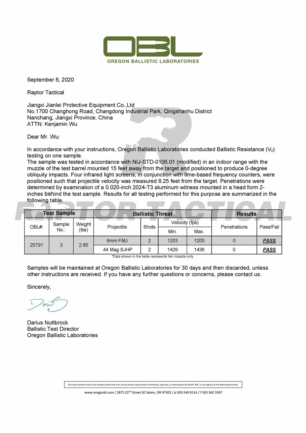 NIJ IIIA 0106,01 совместимый, протестирован вДушильная баллистическая лаборатория, США