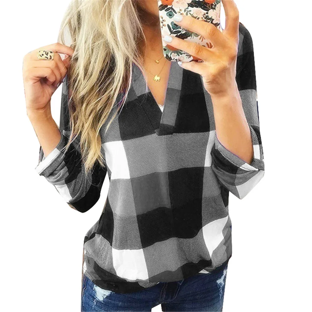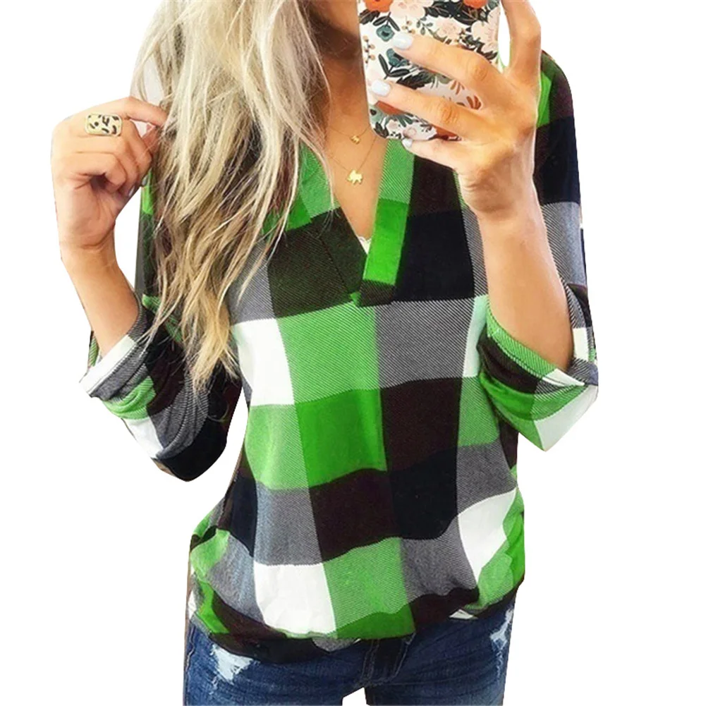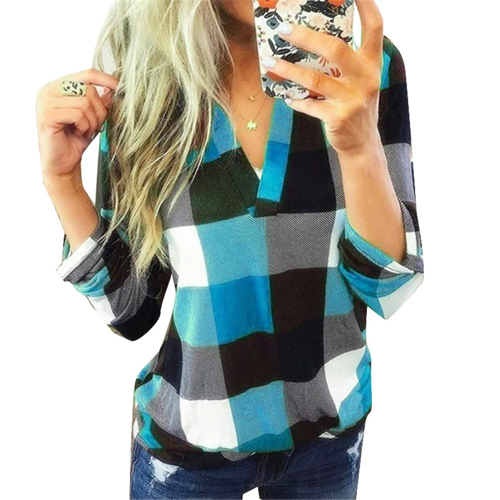 Модные женские блузки размера плюс, клетчатый Топ с длинным рукавом и v-образным вырезом, повседневные женские блузки, 2019