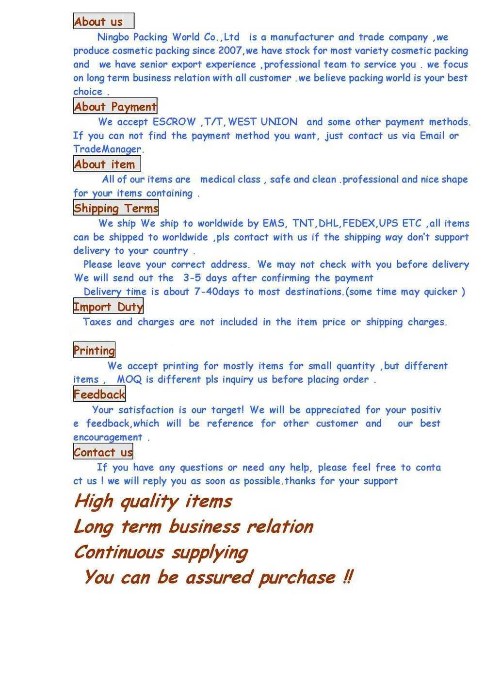 Магазина packing world -cosmetic and medicine packing работает с 01.04.2011. его рейтинг составлет 95.45 баллов из 100. В избранное добавили 1732 покупателя. Средний рейтинг торваров продавца 4.8 в продаже представленно 3223 наименований товаров, успешно доставлено 264 заказов. 44 покупателей оставили отзывы о продавце.