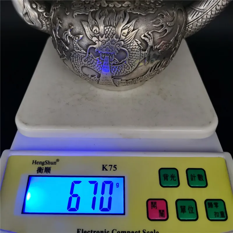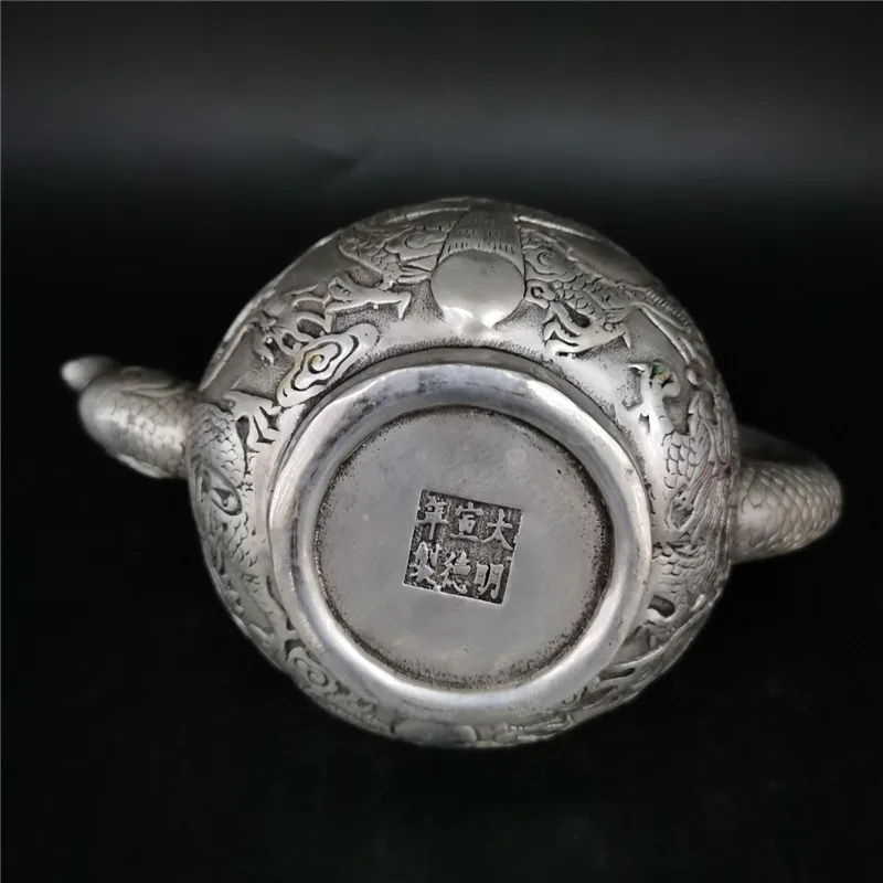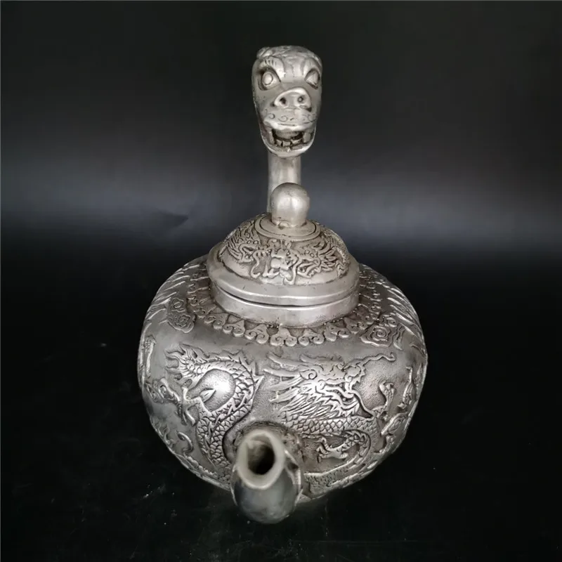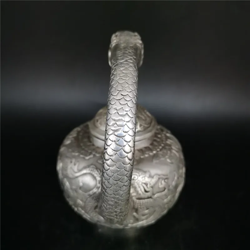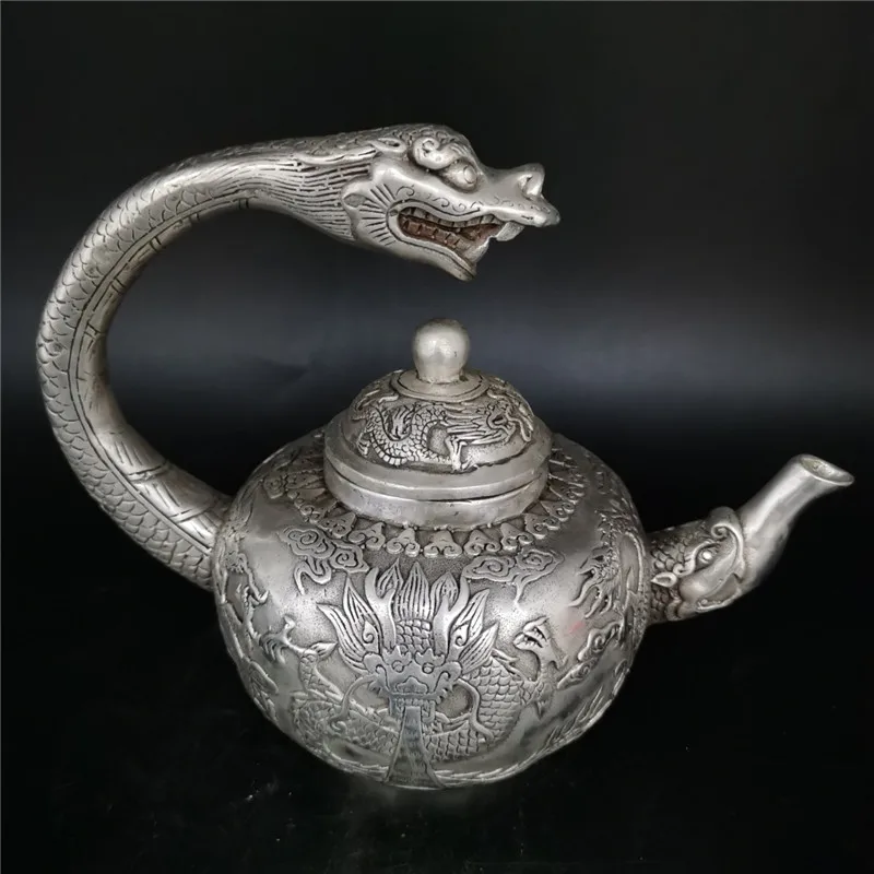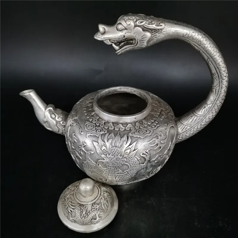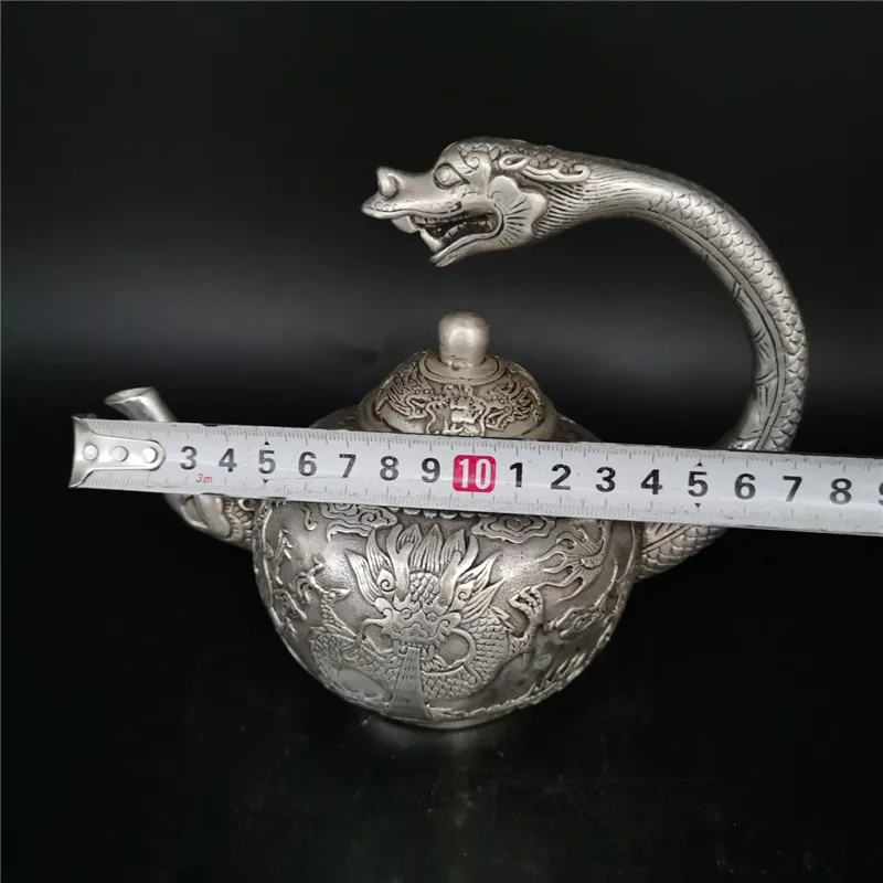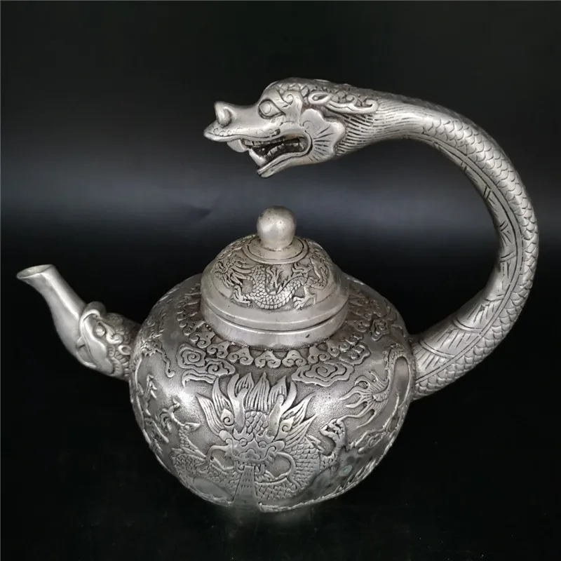 Китайский Старый тибетский серебряный резной дракон в форме ручки винный горшок