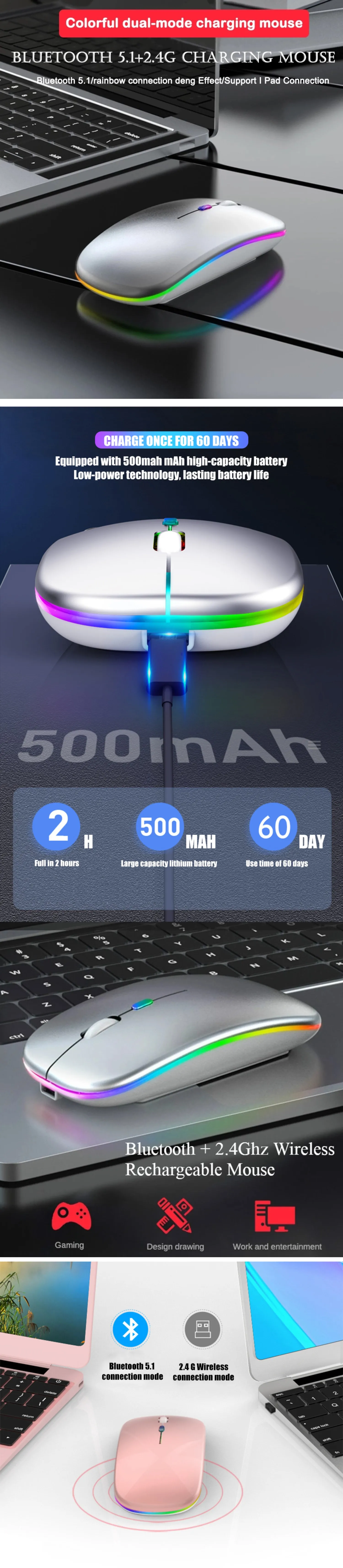 USB Bluetooth + 2,4G мышь перезаряжаемая эргономичная оптическая беспроводная мышь для ноутбука, компьютера, ПК, светодиодный двойной режим подсветки, бесшумная мышь