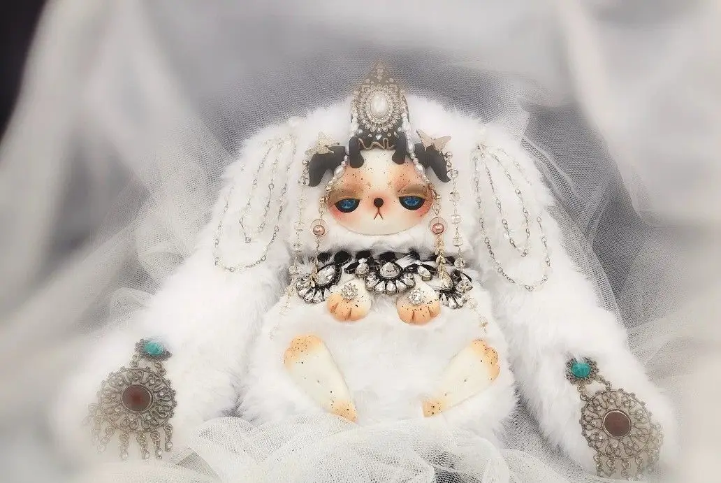 Голова замешана в глину, тело имитирует мех кролика и лисы