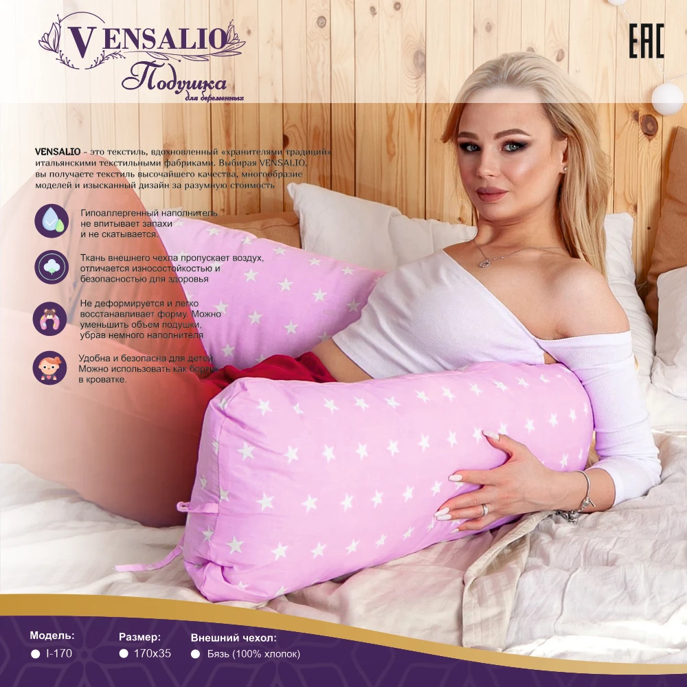 Подушка для беременных Vensalio I-170 обнимашка, 170х35 см с чехлом;
