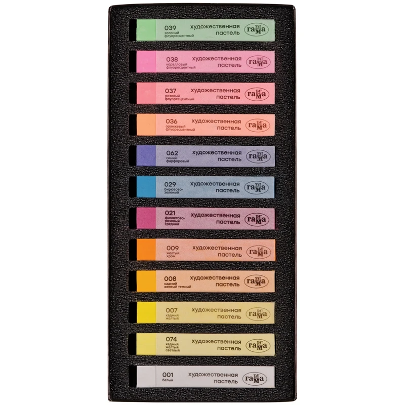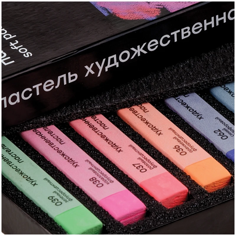 Набор сухой художественной пастели средней мягкости. В наборе мелки квадратной формы в индивидуальной бумажной гильзе с указанием цвета. Пастель легко наносится, смешивается и растушевывается. Цвета в наборе яркие, насыщенные, светостойкие. Флуоресцентные цвета устойчивые.