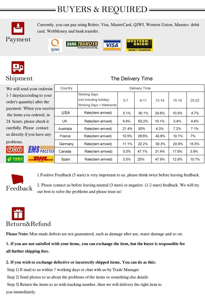 1. Если вам нужен товар срочно, пожалуйста, выберите ePacket, авиапочту Китая, стандартную премиальную доставку Aliexpress или другую Экспресс-доставку, такую как DHL,EMS,UPS и т. д.