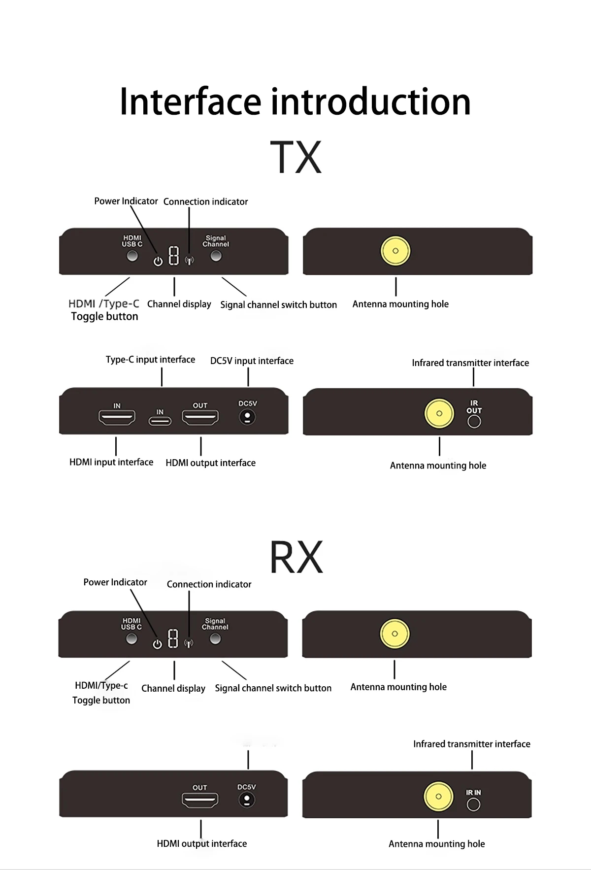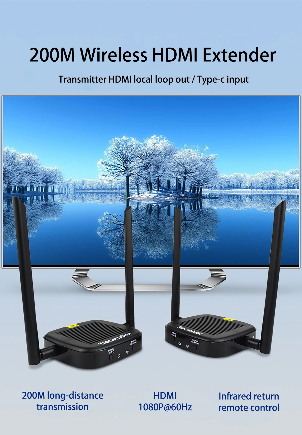 Непрерывная передача видео и аудио сигналов HDMI через беспроводной модуль 5,8G Дальность передачи в открытой среде до 200 метров. Инфракрасное обратное управление с поддержкой микрофона Входная поддержка TYPE-C Поддержка входного интерфейса HDMI Кольцевой выход с поддержкой передатчика Разрешение видеосигнала HD до 1920*1080P @ 60 Гц Совместимо с разъемом HDMI 1,3 Для сжатия и распаковки видео используется международный стандарт H.264, что эффективно повышает эффективность передачи и обеспечивает плавное воспроизведение. Совместимо с HDCP 1,2-Технология защиты цифрового содержимого с высокой пропускной способностью. Возможность автоматической идентификации и настройки различных режимов отображения. Встроенная автоматическая система выравнивания, изображение гладкое, прозрачное и стабильное Проста в установке, подключи и работай, не нужно устанавливать.