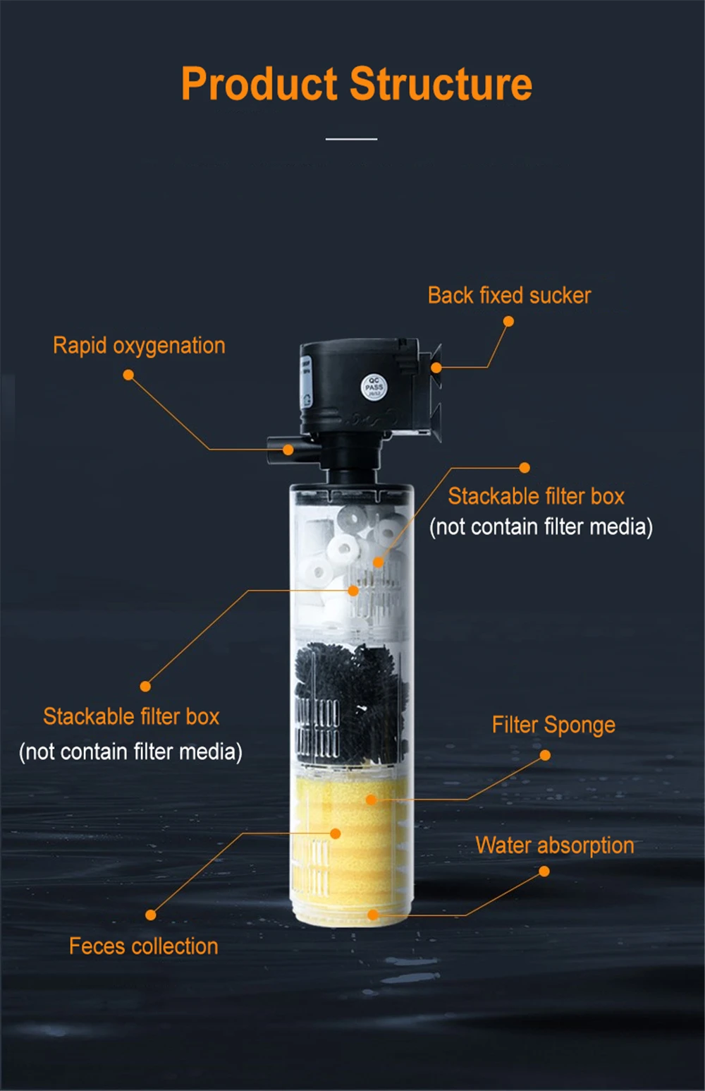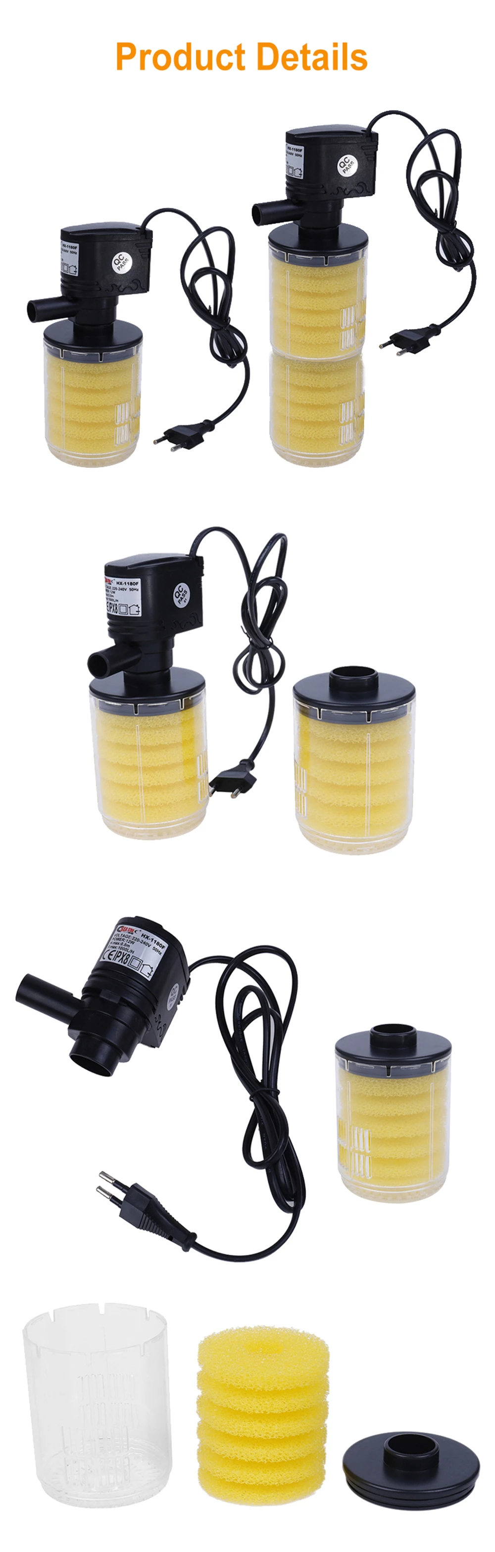 Этот водяной насос может достичь многофункциональности, циркуляции воды, внутренний фильтрующий материал может поддерживать воду в чистоте и облегчать адгезию микроорганизмов и может создавать много пузырьков эффекта для увеличения кислорода.