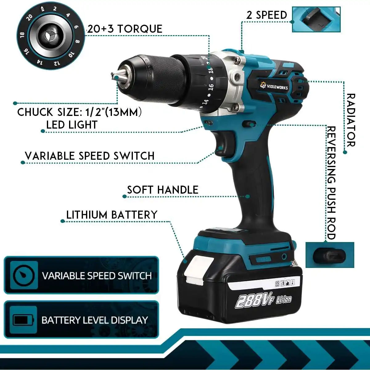 3 в 1 288VF Аккумуляторная дрель электрическая ударная отвертка Ударная дрель 20 + 3 крутящего момента 13 мм |