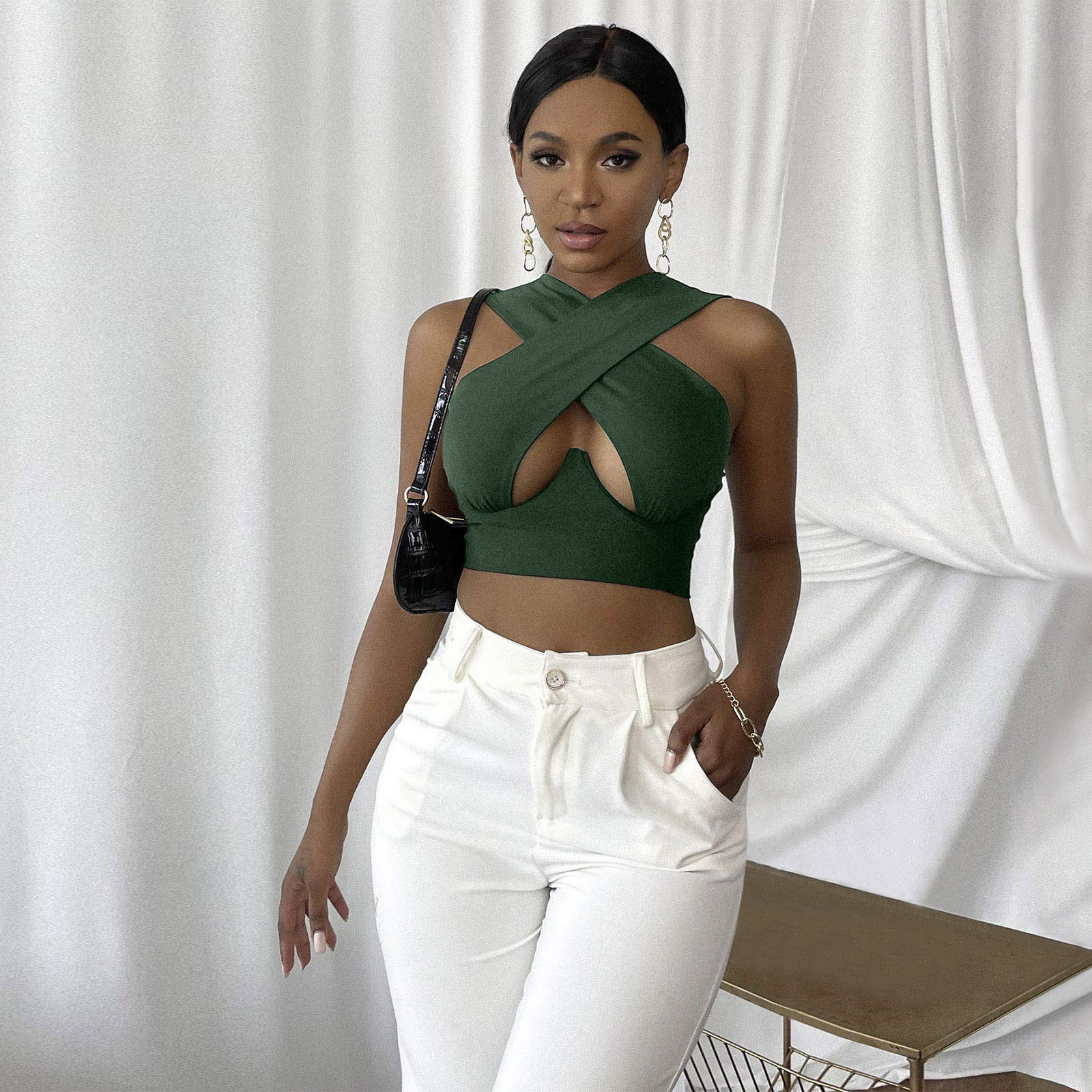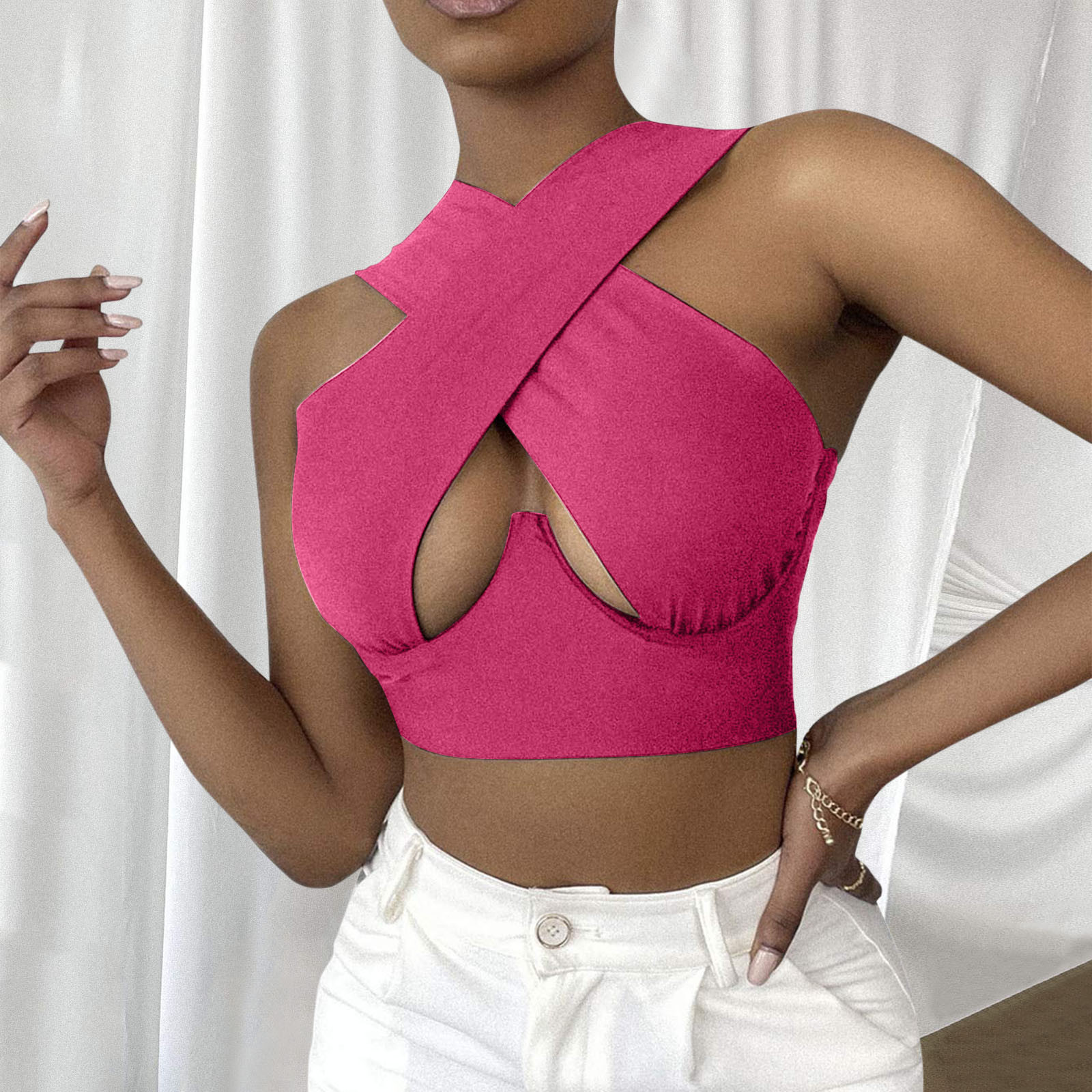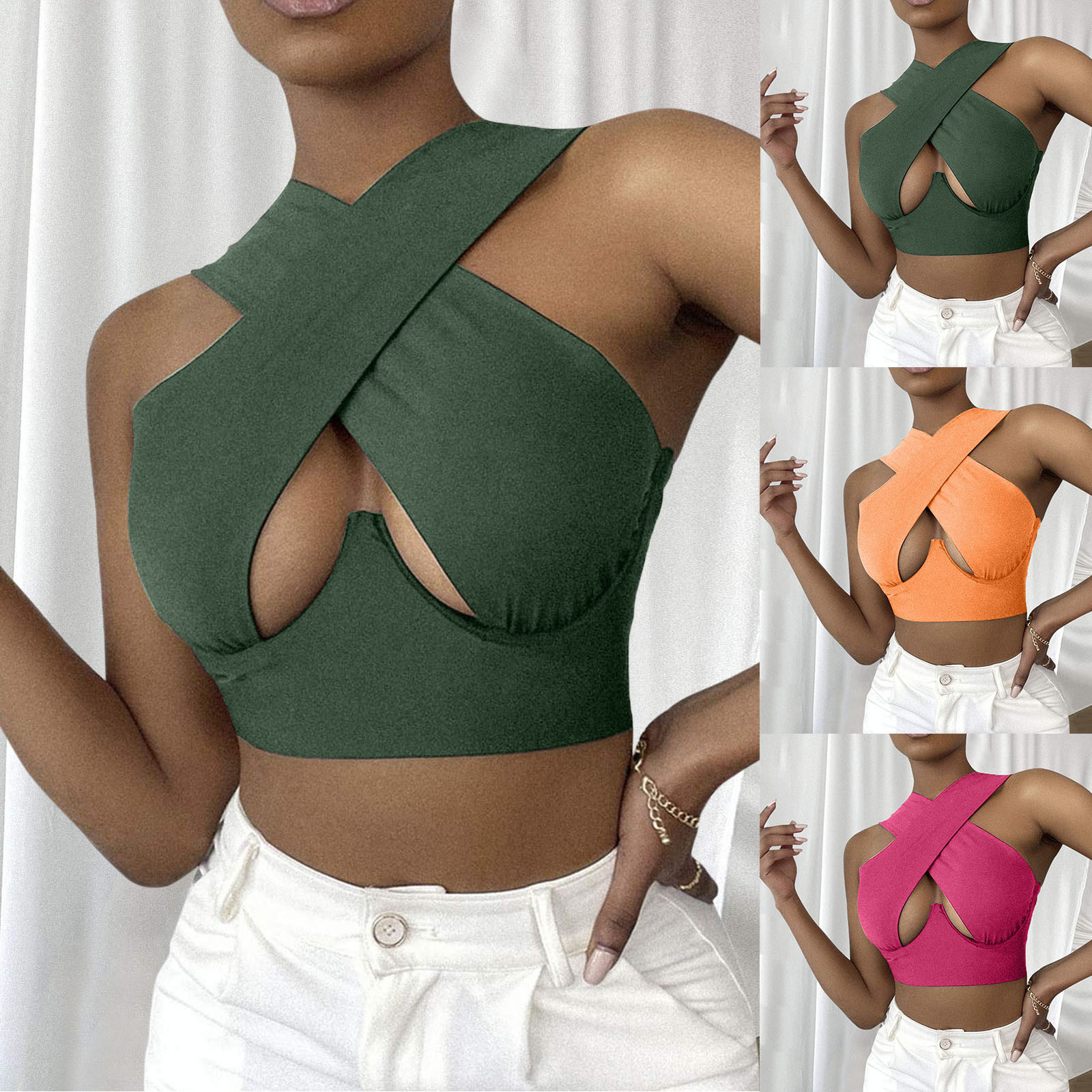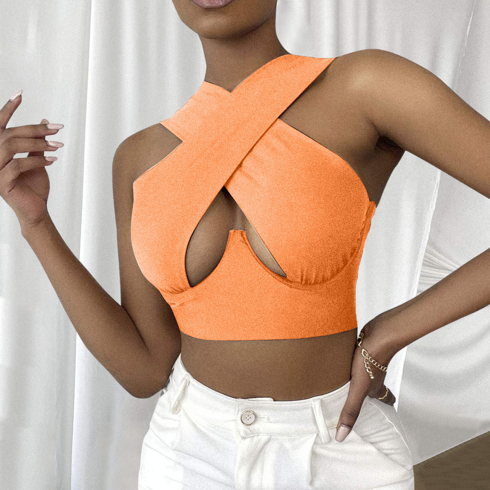 Женский укороченный топ с перекрестным вырезом и лямкой на шее, однотонные майки