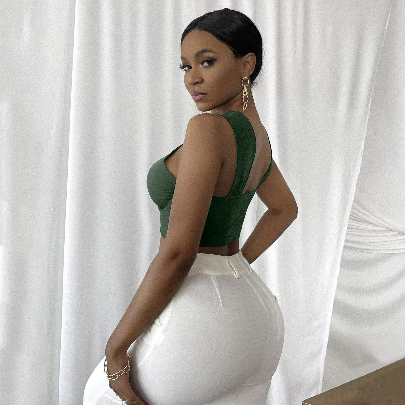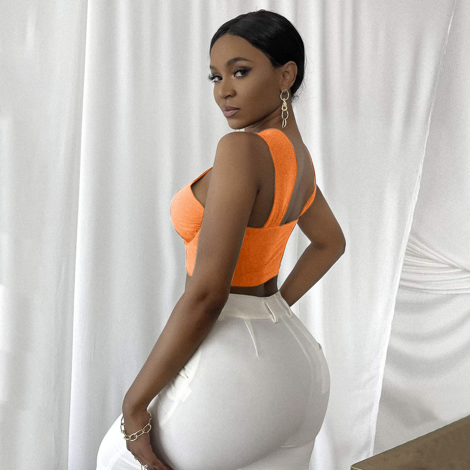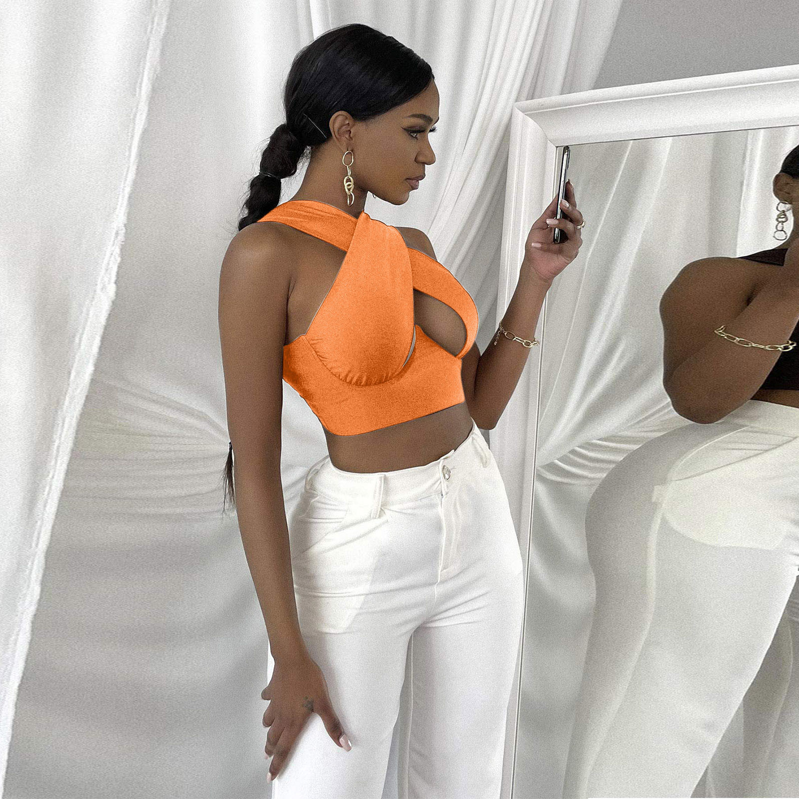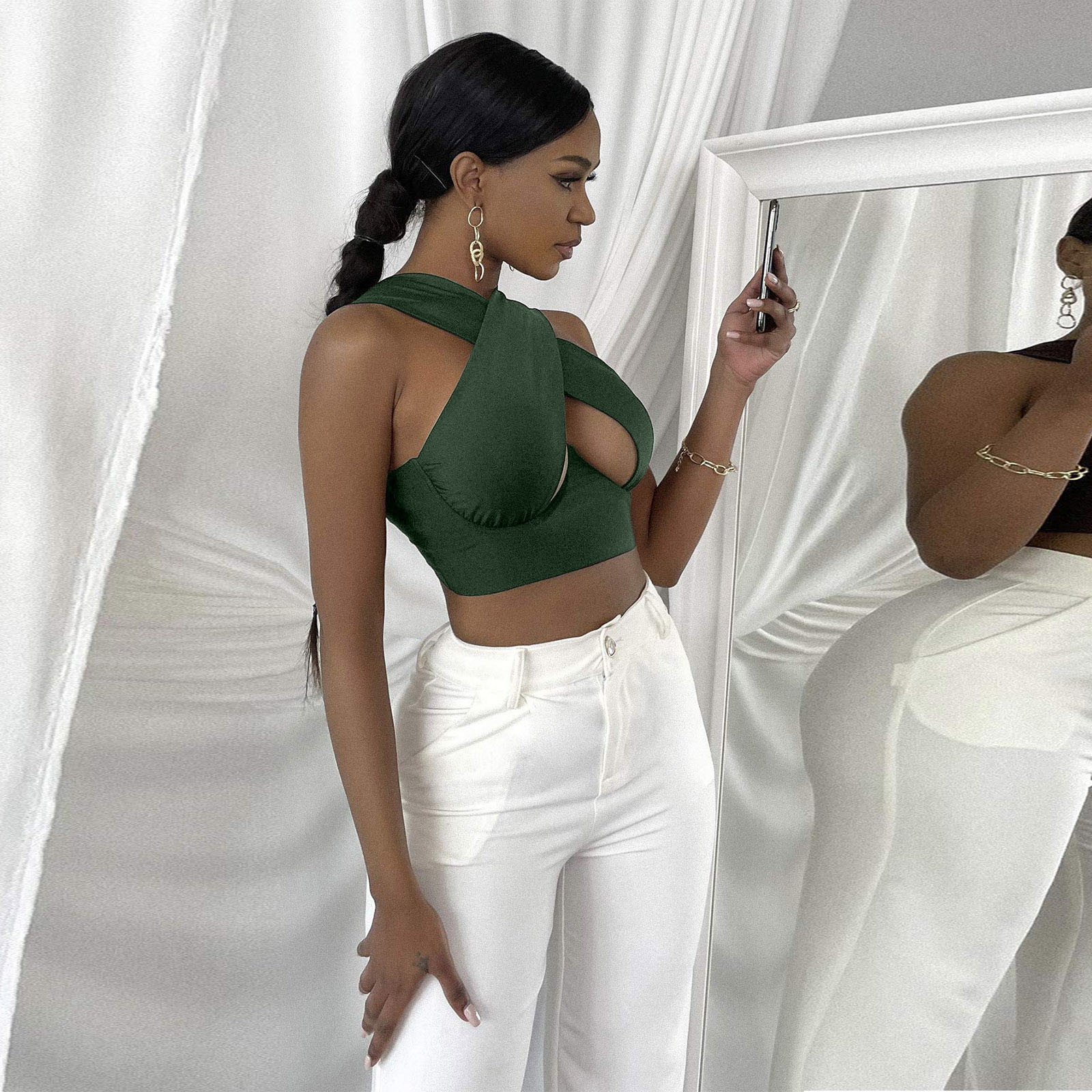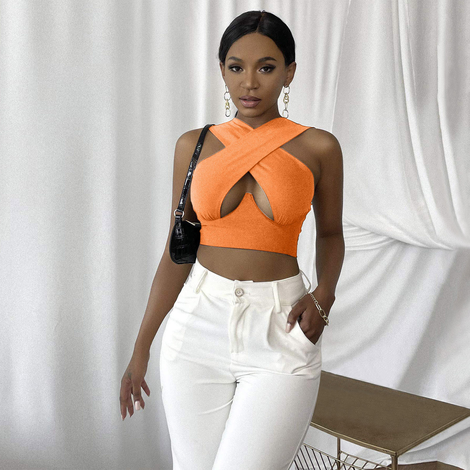 Женский укороченный топ с перекрестным вырезом и лямкой на шее, однотонные майки