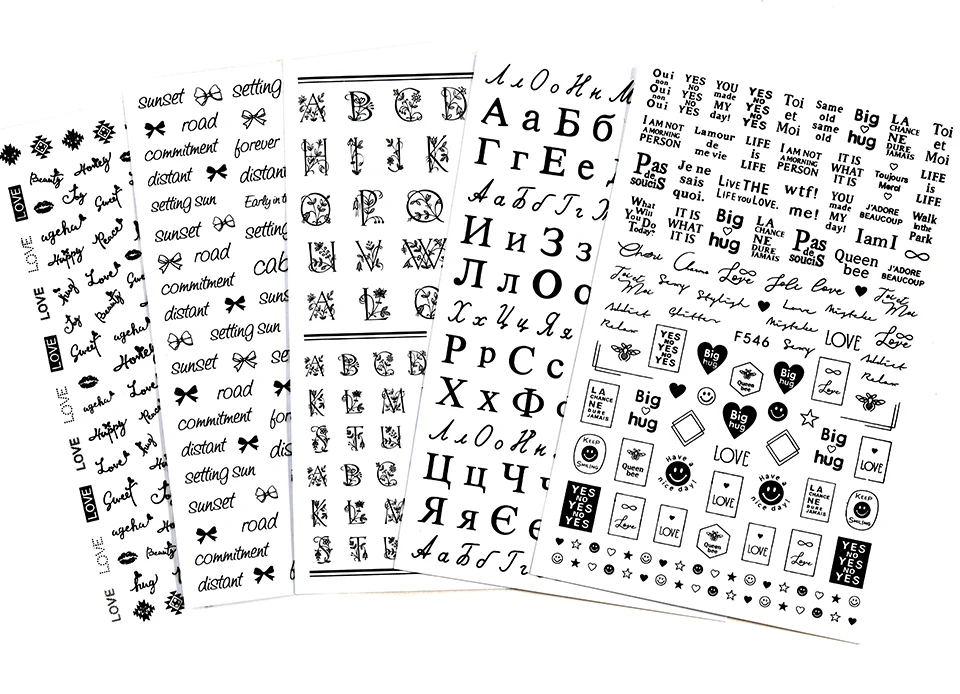 Brand NameAMGKModel NumberMJ262OriginMainland ChinaSize12.2*7.5CMMaterialNail StickersStyleEnglish alphabet Stickers for NailsQuantity1PCItem TypeSticker & DecalNumber of PiecesOne UnitMeasurement unit100000015Sold insell_by_pieceEach pack1Package weight0.009Package size - length (cm)12Package size - width (cm)18Package size - height (cm)1