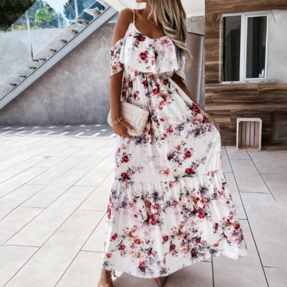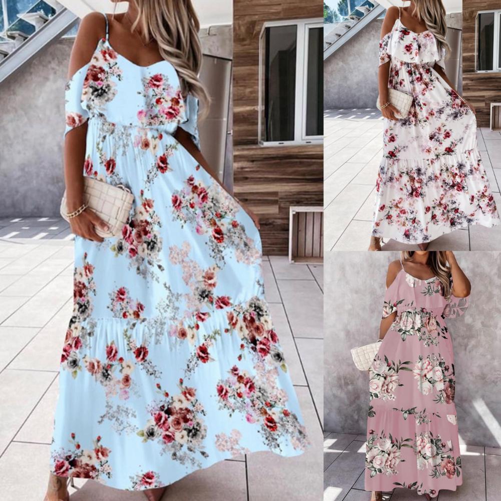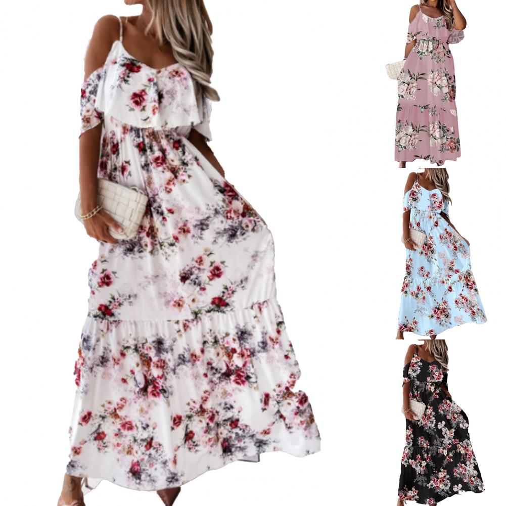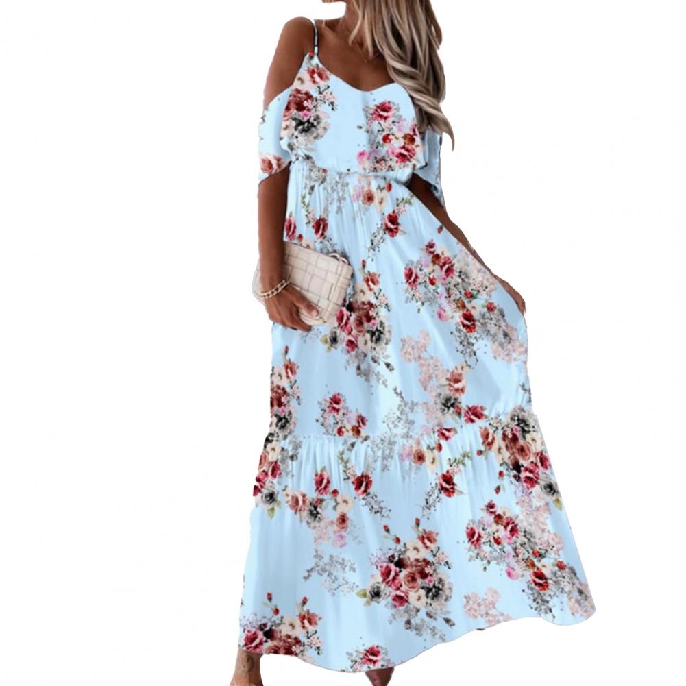 Это платье с цветочным принтом, большим подолом, открытыми плечами и короткими рукавами, которое является богемным и модным.