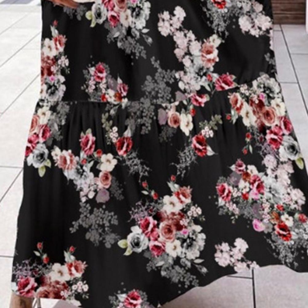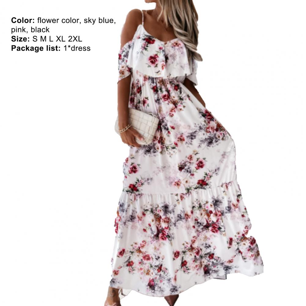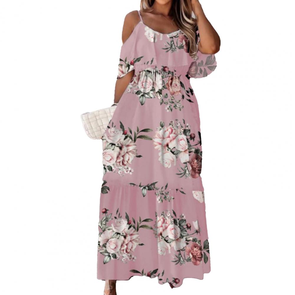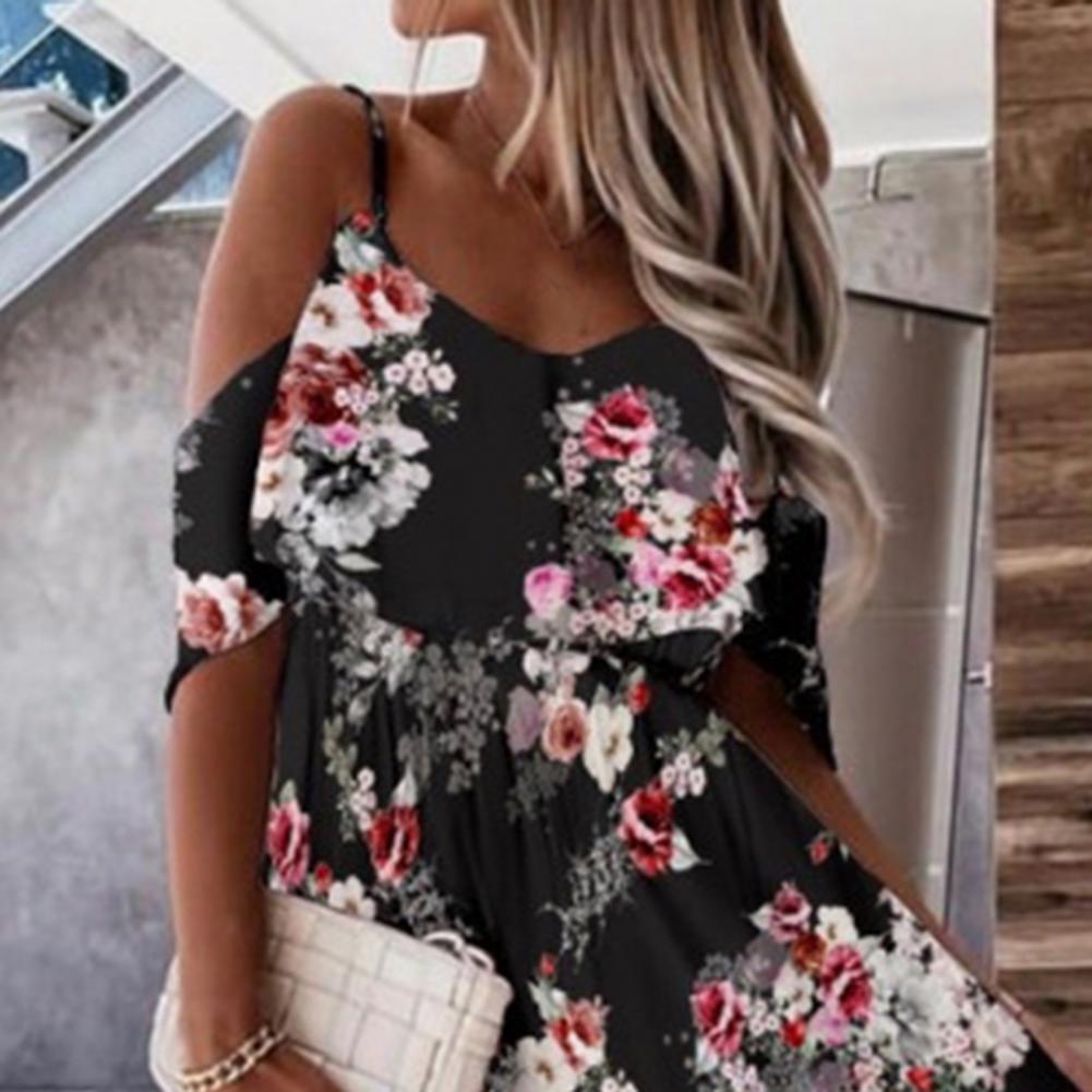Это платье с цветочным принтом, большим подолом, открытыми плечами и короткими рукавами, которое является богемным и модным.