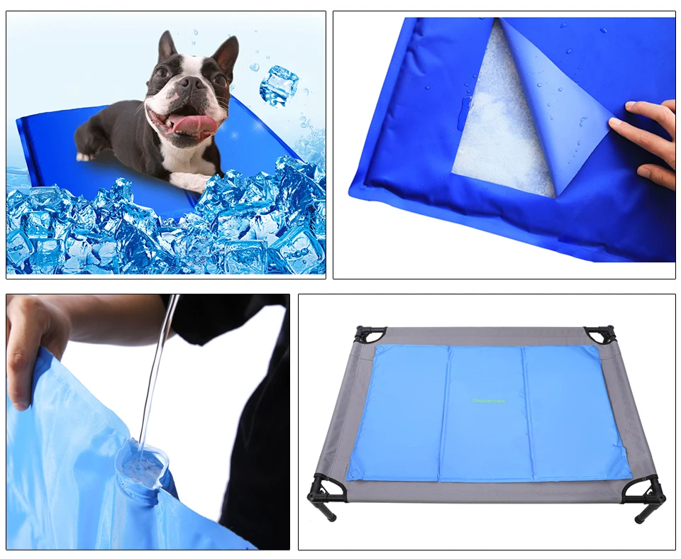 Пункт продажиСпециальный охлаждающий коврик: В отличие от других аналогичных продуктов, он может быть заполнен водой в любое время, поэтому он используется для длительного времени, сохраняйте охлаждение постоянно, охлаждающий гелевый коврик обеспечивает длительный охлаждающий эффект. Он имеет эффективный срок службы более 3 лет и настолько прочный, что вам не придется беспокоиться о том, что ваш питомец поцарапает его. И он прост в использовании, откройте отверстие для орошения, заполните нужное количество воды, и он готов к использованию