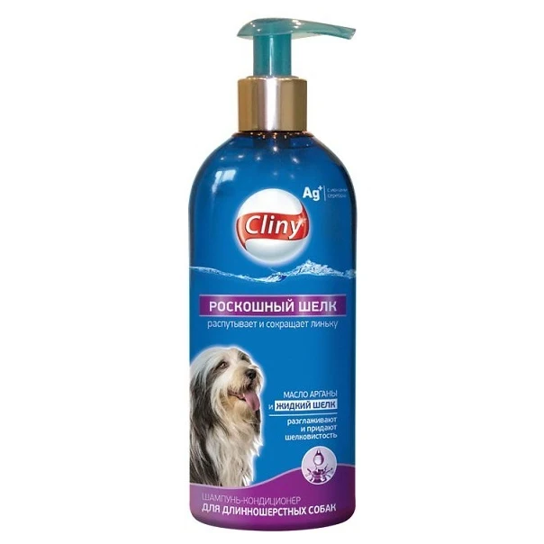 Сегодня шампунь — основное средство для ухода за кожей и шерстью питомцев. Основная функция шампуня — гигиенический уход, очищение кожи и шерсти от кожного сала, пыли и грязи. Качественные шампуни для животных совмещают как гигиенический, так и косметический уход — ухаживают за кожей и шерстью, питают и восстанавливают волосы, сокращают линьку. "Cliny" — это первая серия по уходу за животными с ионами серебра. Ионы серебра обладают мощным бактерицидным действием широкого спектра, не вызывают аллергии. Шампуни "Cliny" — продукт профессионального качества. Они созданы с учётом особенностей кожи и шерсти животных: мягко очищают, ухаживают за кожей и шерстью, дают превосходный результат. Эффект посещения груминг-салона у Вас дома! Для шампуней "Cliny" разработана специальная, легкосмываемая формула: шампунь легко распределяется и легко смывается с кожи и шерсти. Шампунь-кондиционер "Роскошный шёлк" разработан специально для длинношёрстных собак: - распутывает и сокращает линьку; - разглаживает шерсть и придает шелковистость. Активные компоненты: - масло арганы профилактирует образование колтунов, облегчает расчёсывание и активизирует рост шерсти; - экстракты алоэ вера и пророщенной пшеницы (витамин Е и провитамин В5) глубоко увлажняют и питают, поддерживают гидролипидный баланс кожи; - натуральный жидкий шёлк придает шерсти здоровый шелковистый блеск и избавляет от статического электричества; - ионы серебра оказывают антибактериальный эффект, защищая от воздействия патогенной микрофлоры. Порядок применения: шампунь не требует разведения — он сразу готов к использованию. Хорошо смочите кожу и шерсть животного водой, нанесите шампунь, помассируйте до образования пены и тщательно смойте. Просушите и расчешите. Состав: экстракт алоэ вера, Silk Protein (жидкий шелк), масло арганы, экстракт пророщенной пшеницы, вода с ионами серебра, вспомогательные вещества. Состав разработан компанией Neoterica (Германия).