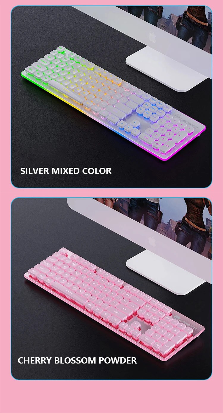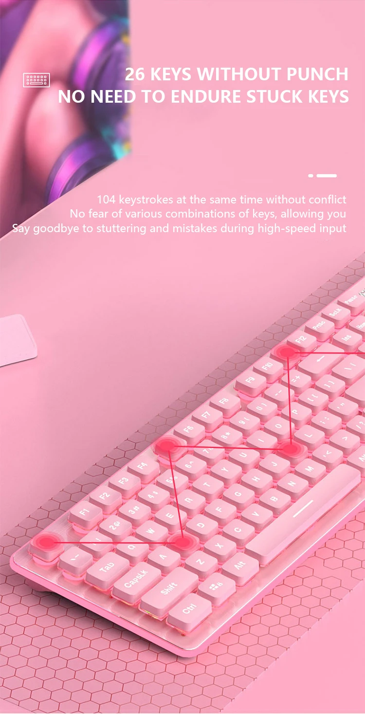 Розовый механический Игровой Набор клавиатуры и мышиОбновление новой функции:Обновление новой функции. Матовая металлическая панель. Матовая металлическая панель. ВодонепроницаемыйИ пылезащитный дизайн. Подключи и работай. Кнопка отключения звука. Кнопка отключения звука. Несколько настроек освещения. Эргономичный дизайнОсобенности клавиатуры: