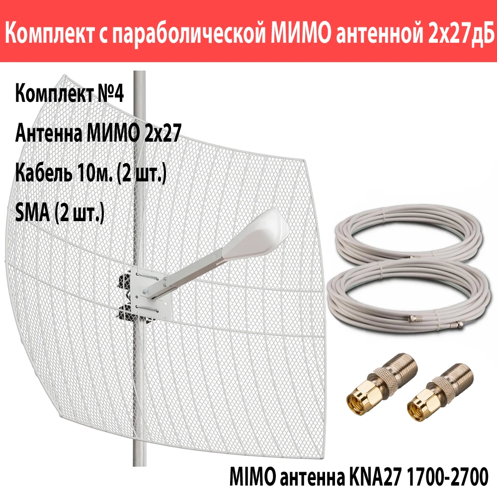 Готовый комплект с параболической антенной KNA27 MIMO 2x27 Российского производства с максимально большим коэффициентом усиления мобильной связи.