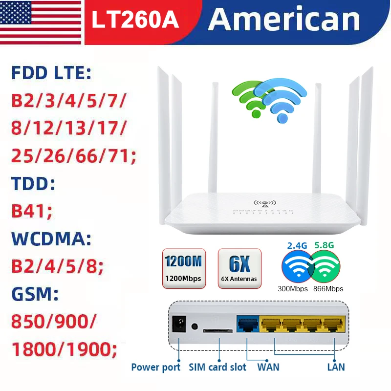 LT260A 1200 Мбит/с VPN двухчастотный 2,4 ГГц и 5,8 ГГц модем 4G Wi-Fi маршрутизатор со слотом для SIM карты