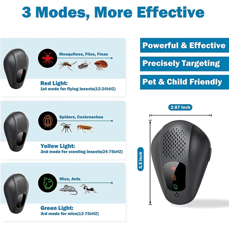 [Дизайн 3 в 1 и отказ от всех вредителей] три частотных режима обеспечивают точный репеллент от вредителей. Пожалуйста, выберите соответствующий режим, нажав кнопку сбоку и непрерывно Используйте в течение 3-4 недель для достижения наилучших результатов. (Для комаров, предлагаем 30-40 дюймов от земли. Для мышей, рекомендуется 7-12 дюймов от земли. И для ползающих насекомых, таких как тараканы, непосредственно устанавливается в области вредителей.)
