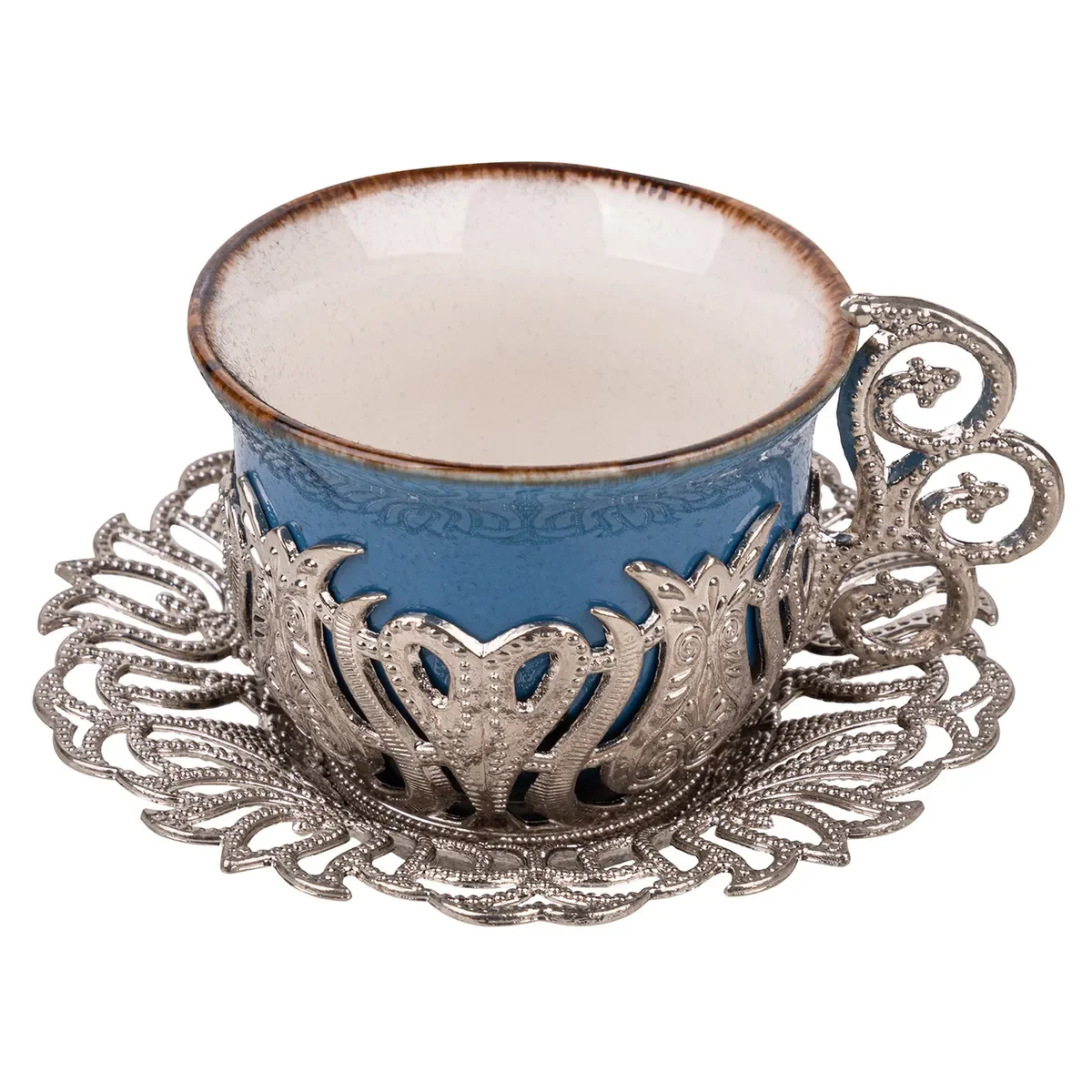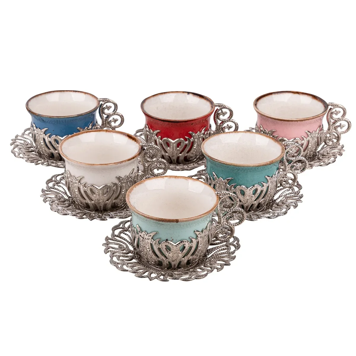 Набор кофе Турецкий Для 6 человек. Цвет металла-серебристый. Фарфоровые чашки в металлический чехол. Изготовлен из плотного и высококачественного металла. Очень красиво, станет прекрасным украшением для любого интерьера. Комплект поставляется в красивой фабричной коробке. Подходит для подарка.