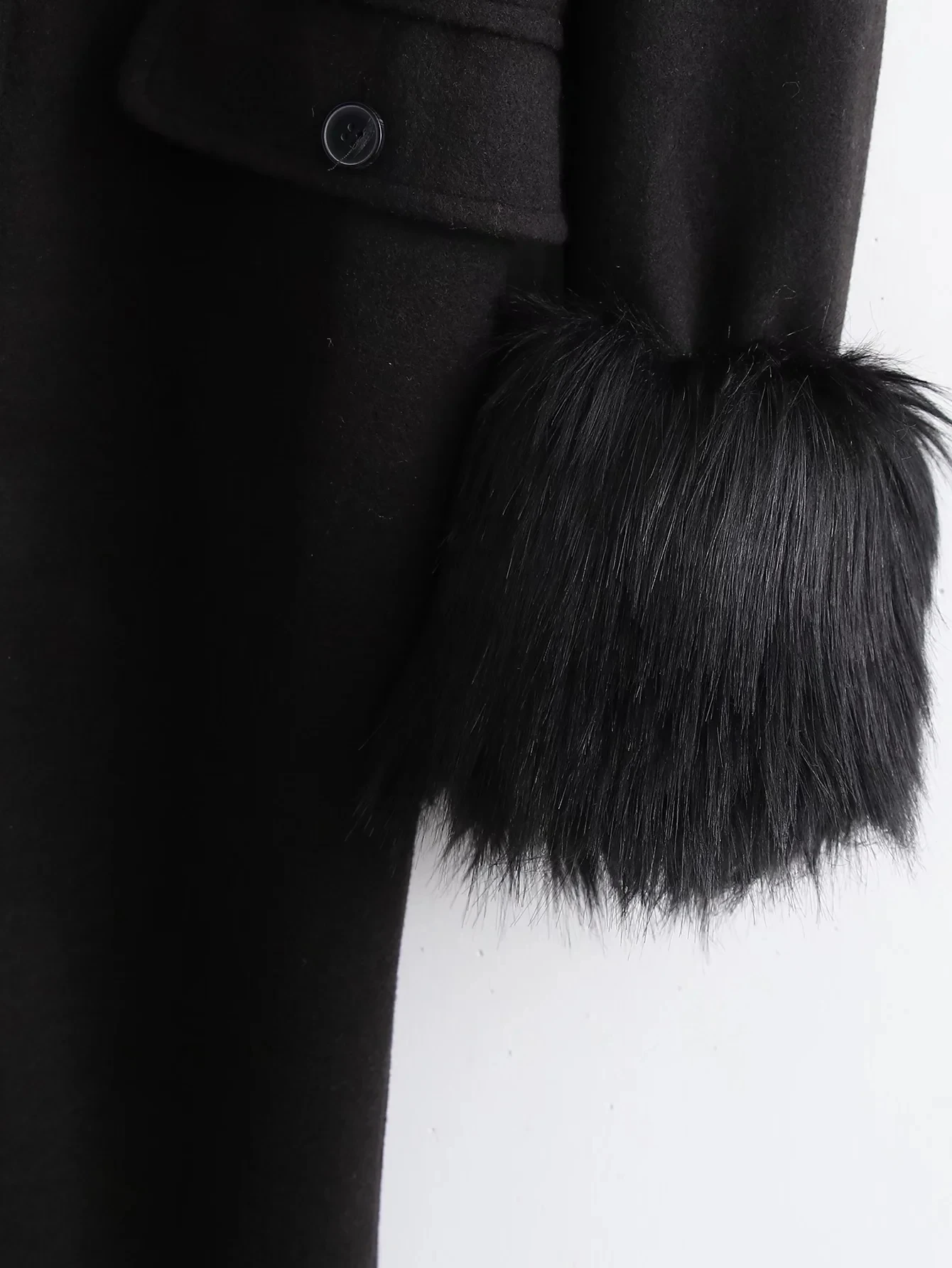 Приталенное пальто из смесовой шерсти. Воротник с отворотами, длинные рукава с аппликацией из искусственного меха, передние карманы с отворотами на пуговицах, пояс с металлической пряжкой на подкладке из той же ткани, подходящая подкладка, заднее отверстие на подоле