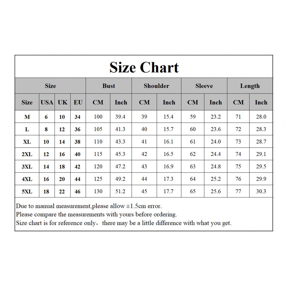Размер: 5XL, обхват груди: 130 см/51,2 дюйма, длина: 77 см/30,3 дюйма, длина рукава: 65 см/25,6 дюйма, ширина плеч: 45 см/17,7 дюйма (прибл.)