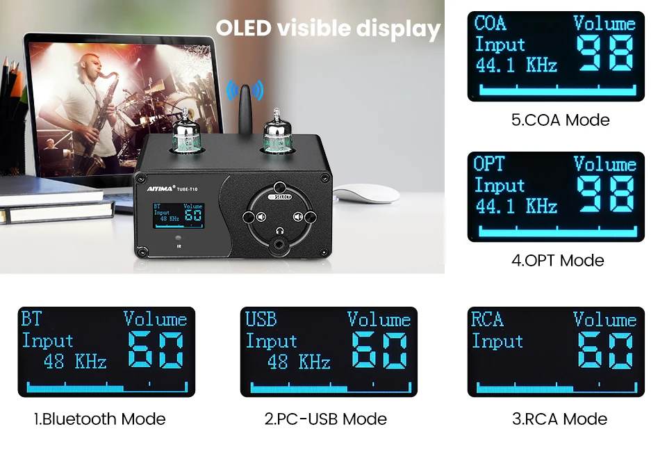 Tube-T10 Поддержка Bluetooth/PC-USB/COAX/OPT, он может совместим с большинством аудио оборудования на рынке.
