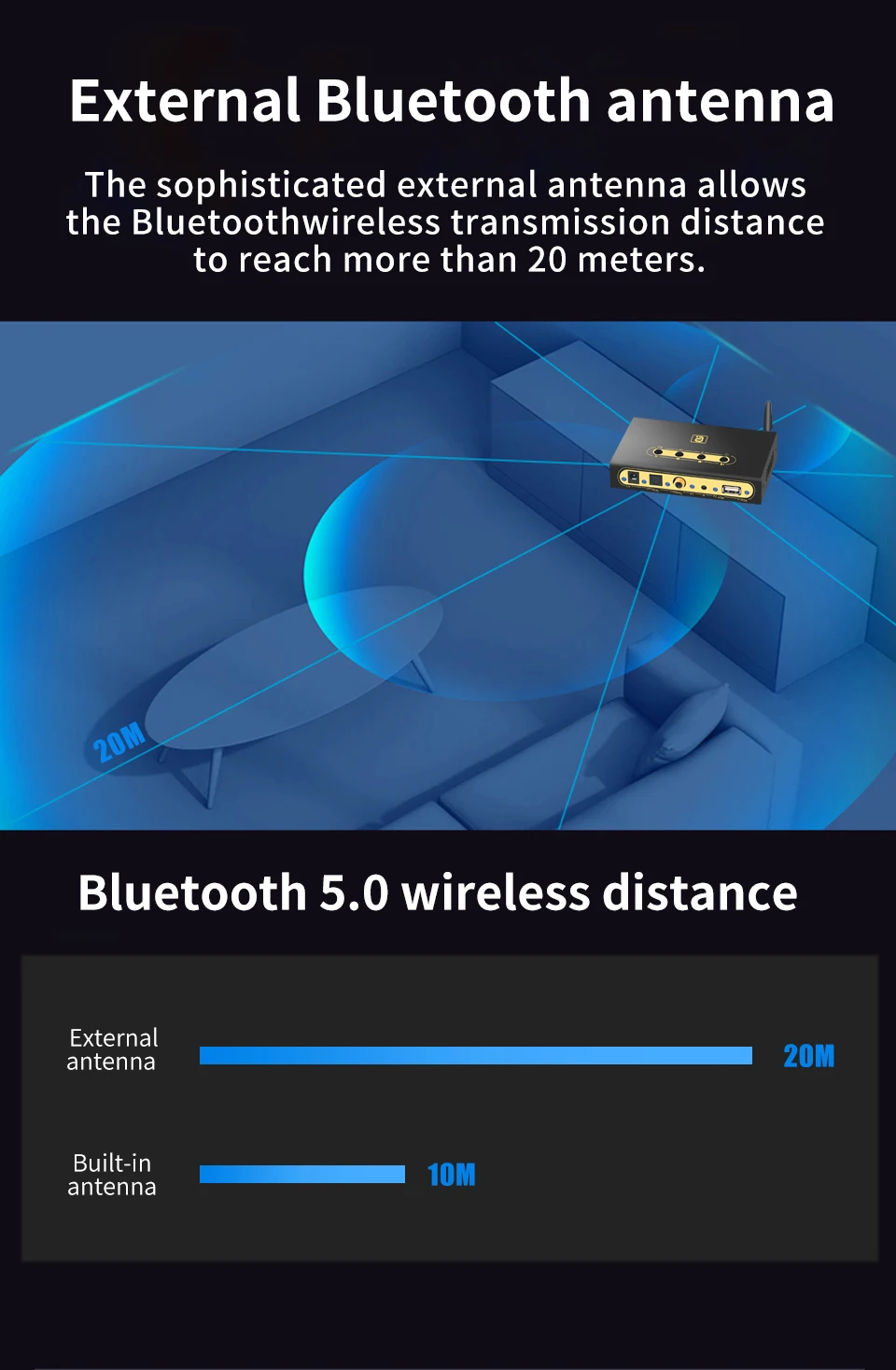 1. Поддерживает один оптический вход, один коаксиальный вход, вход Bluethooth 5,0, один вход USB 2,0, один вход PC-USB. Вы можете переключать различные источники сигнала в случайном порядке с помощью кнопки или пульта дистанционного управления
