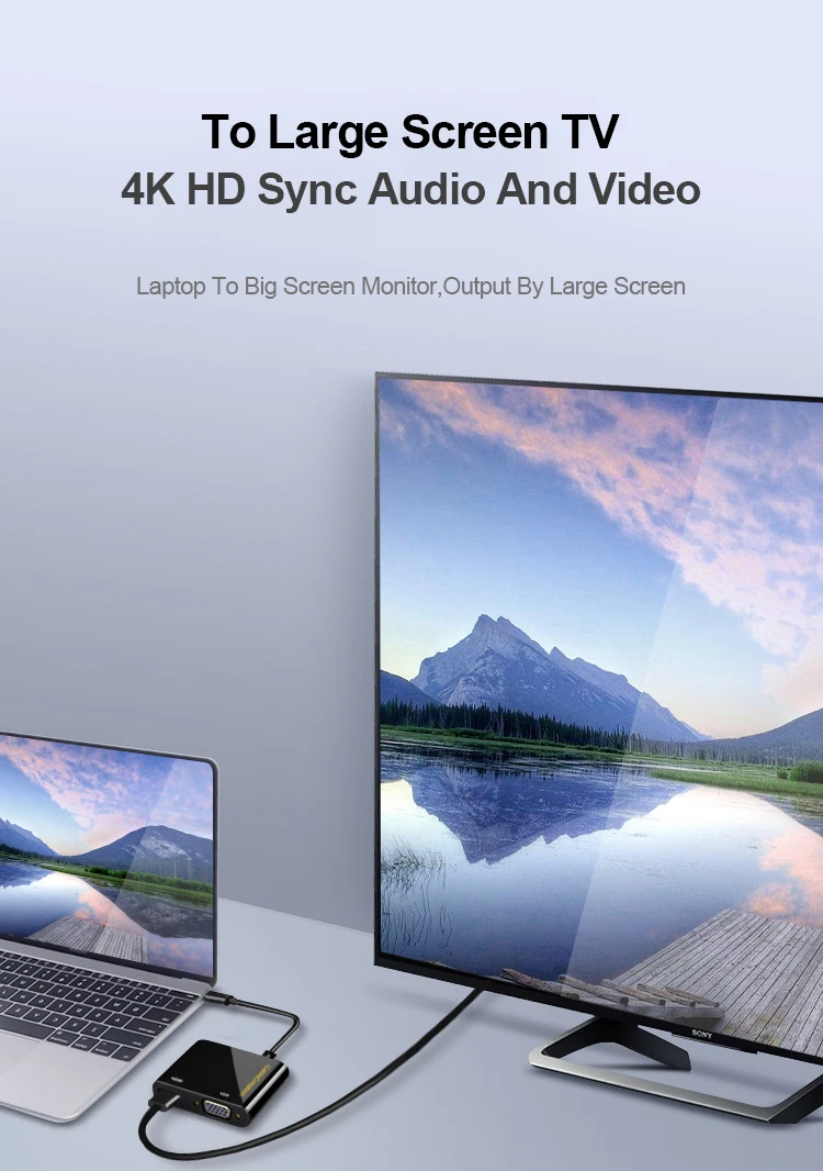 Он позволяет передавать сигналы от источника Type-C на HD или VGA дисплей высокой четкости (Телевизор, проекторы, монитор и т. Д.). Он может работать на Macbook Pro,Macbook Air 2018,Dell XPS 13/15, Google new Chromebook Pixel и других поддерживаемых USB-C устройствах. С этим адаптером вы можете наслаждаться лучшим визуальным праздником с семьей.