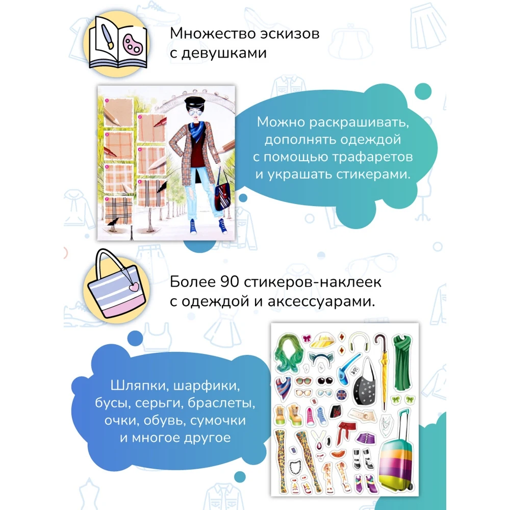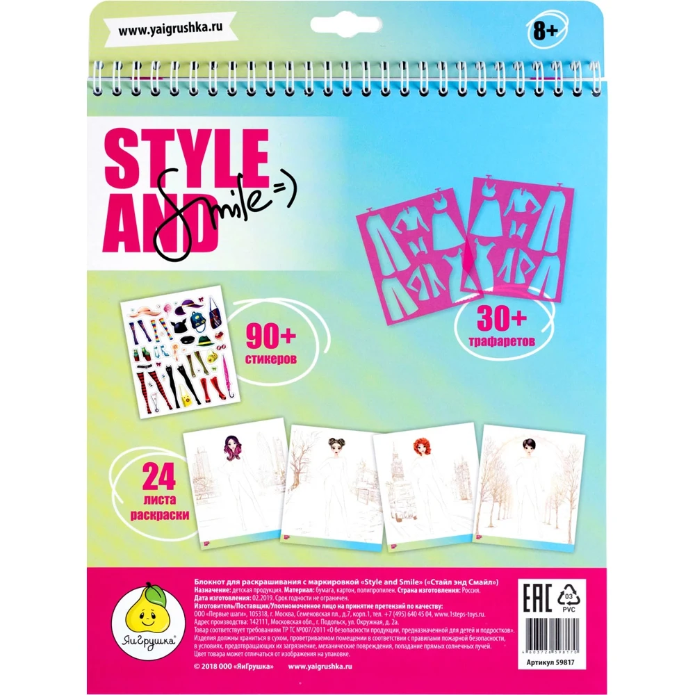Блокнот «Style and Smile» подарит возможность девочкам реализовать себя в качестве художника-модельера одежды. В блокноте множество эскизов, которые можно раскрасить карандашами, дополнить элементами одежды с помощью трафаретов, и украсить аксессуарами-стикерами.