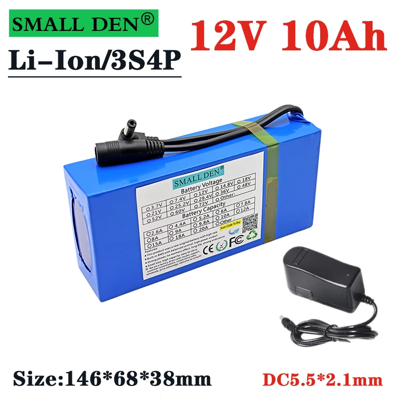 Brand new 12V 10Ah 18650 Li-ion battery pack 10000mAh with BMS circuit protection board DC 5.5*2.1mm+ 12.6V 1A charger