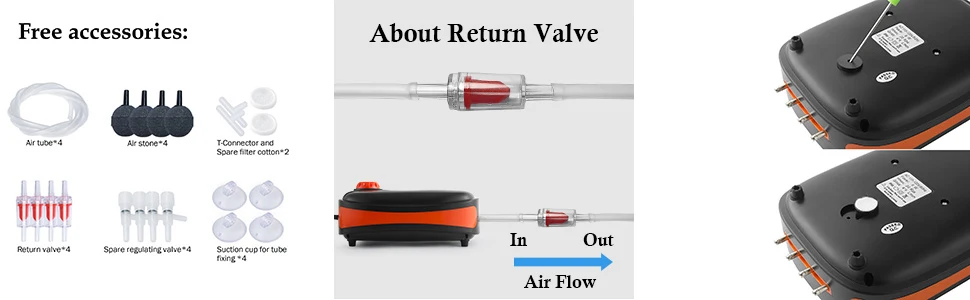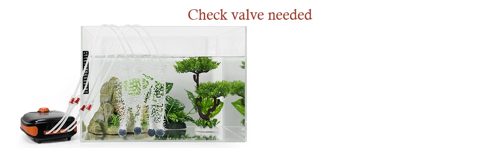 Если вы установите аквариумный воздушный насос ниже уровня воды, должны быть необходимы обратные клапаны, в противном случае вода в воздушном шланге будет погружаться обратно в воздушный насос, повреждение воздушного насоса.