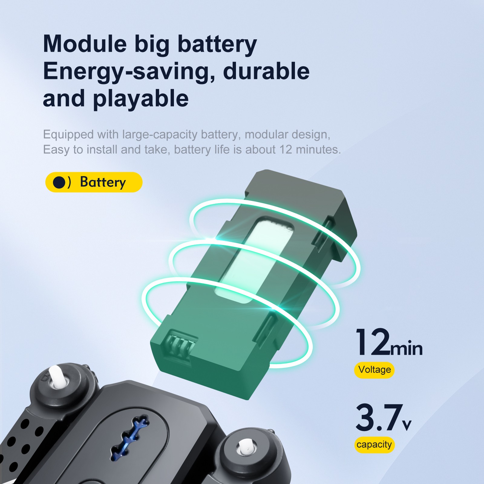 - 3,7 V 600 мАч модульная батарея, просты в установке и взять, время работы от аккумулятора до 10 минут.