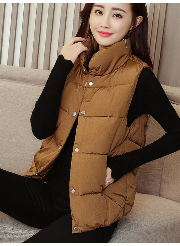 Женский короткий жилет, пальто для женщин, зимний Корейский серый пуховый хлопковый жилет с воротником-стойкой, жилет без рукавов, однотонный модный топ на бретелях