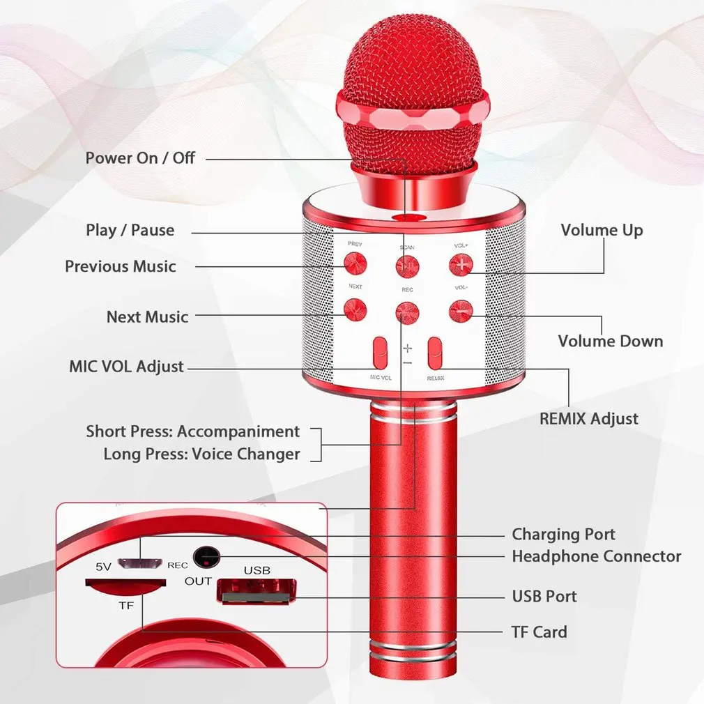 1. Многофункциональный микрофон: портативный беспроводной микрофон может использоваться как микрофон, громкоговоритель, диктофон. Mini home KTV, вы можете проигрывать музыку и песни в любое время и в любом месте.