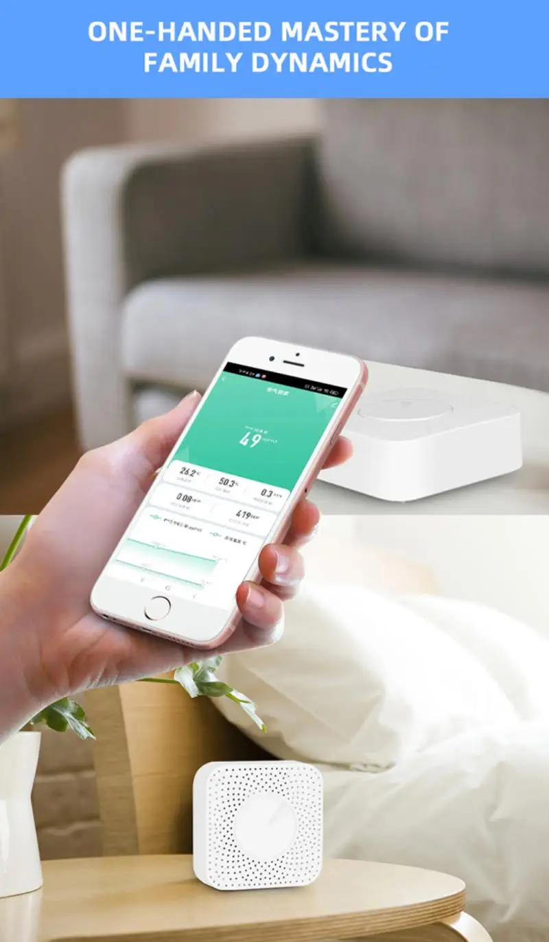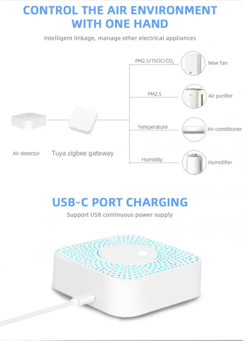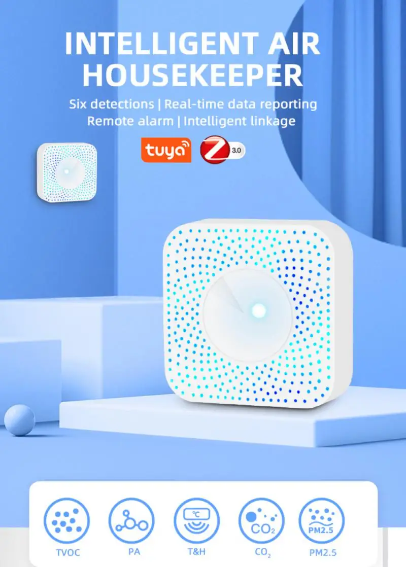 Он также может обнаруживать PM2.5, формальдегид, ЛОС ядовитого газа, CO2, температуру, влажность и т. д. 6 видов экологических параметров, в экологических параметрах автоматически превышают цену, когда граффити Умный домашний Кондиционер воздуха, новый вентилятор, увлажнитель воздуха, очиститель воздуха для оптимизации бытовой среды. Примечание: Пожалуйста, не помещайте воздушную экономку в лампу черного цвета слишком большой, сильный конвекционный воздух или в Высококонцентрированный органический газ в течение длительного времени, в противном случае это будет