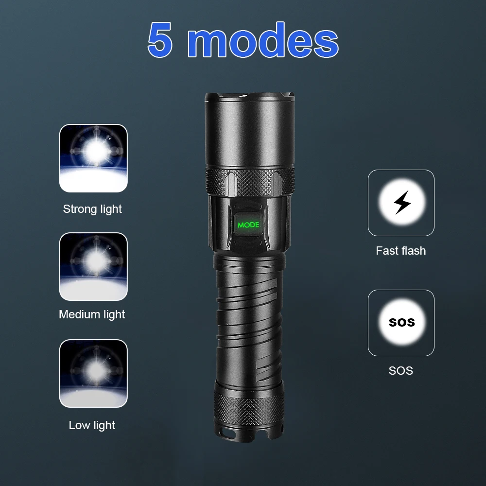In 2022, AliExpress's latest and strongest XHP199 9-cell LED flashlight has a maximum illumination distance of 1500M. Type C charger for charging, use USB to charge fast mobile phone, use 18650 or 26650 battery, can be used for up to 6-15 hours, which perfectly solves the problem of using time of old products. It is the ideal outdoor flashlight for night reading, outdoor travel, adventure and rescue.
