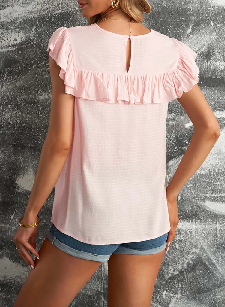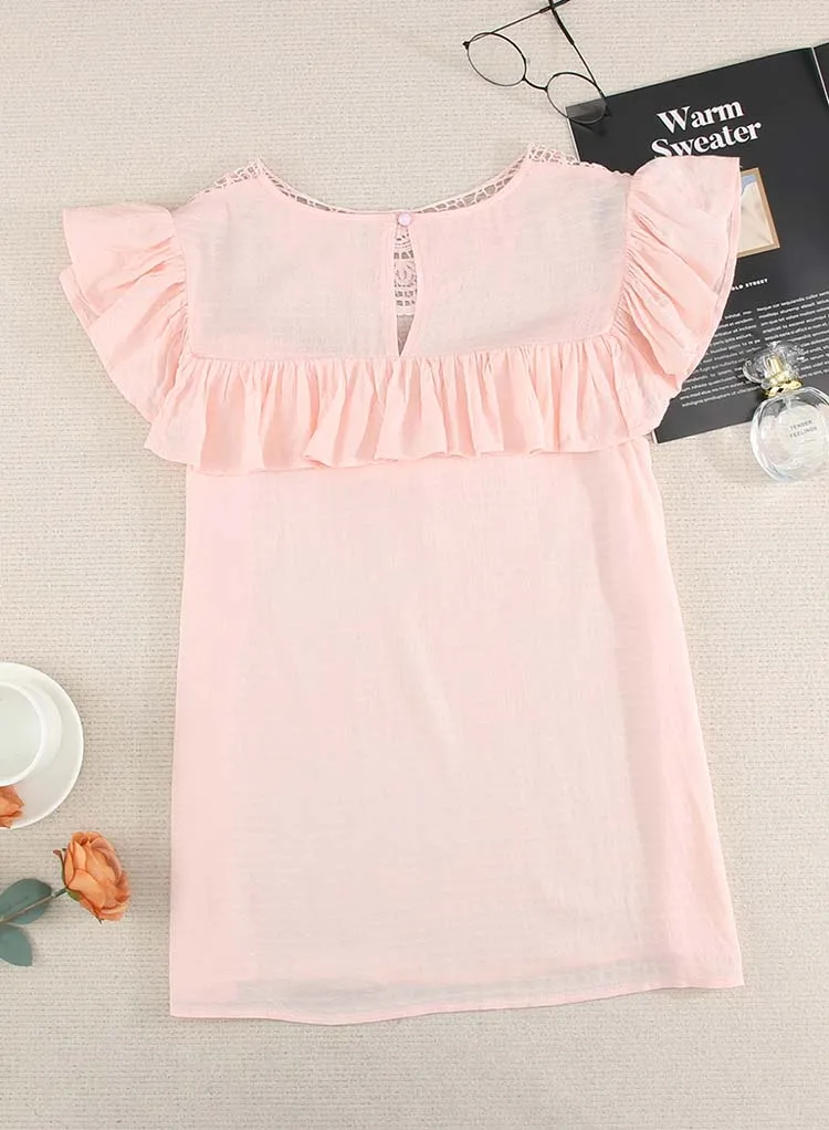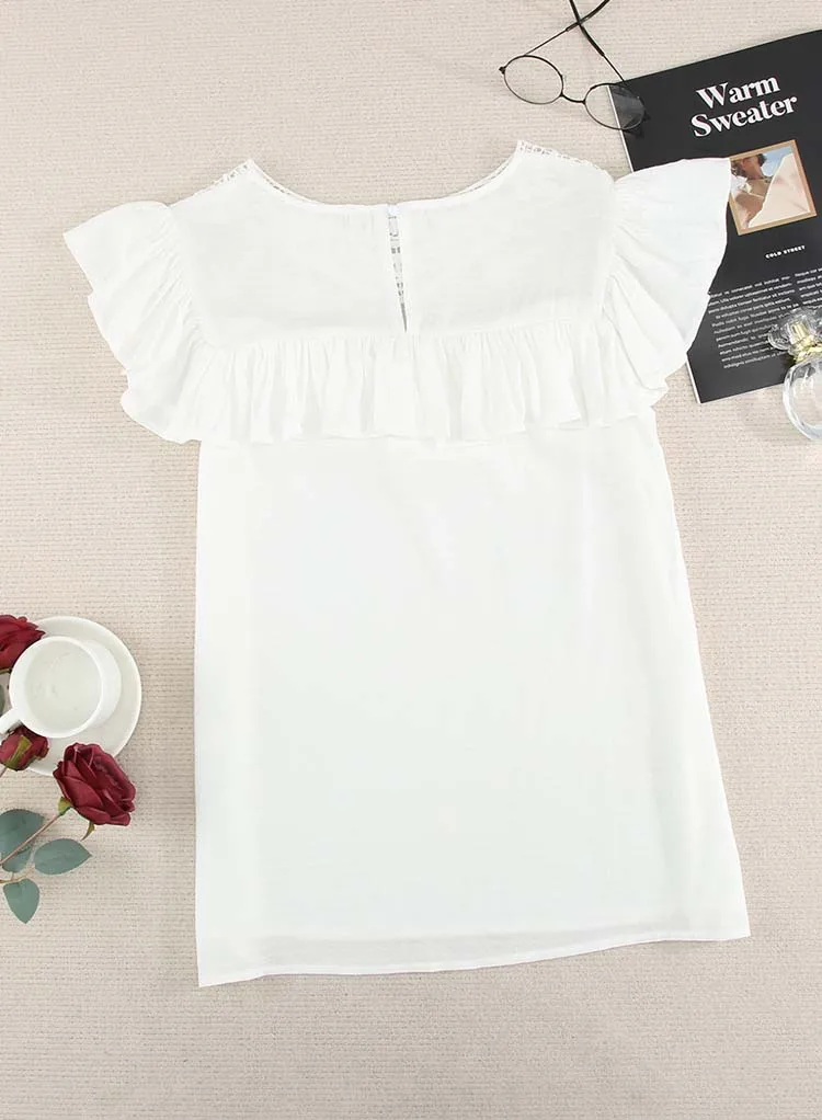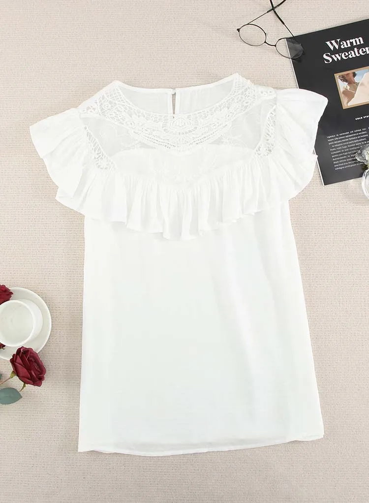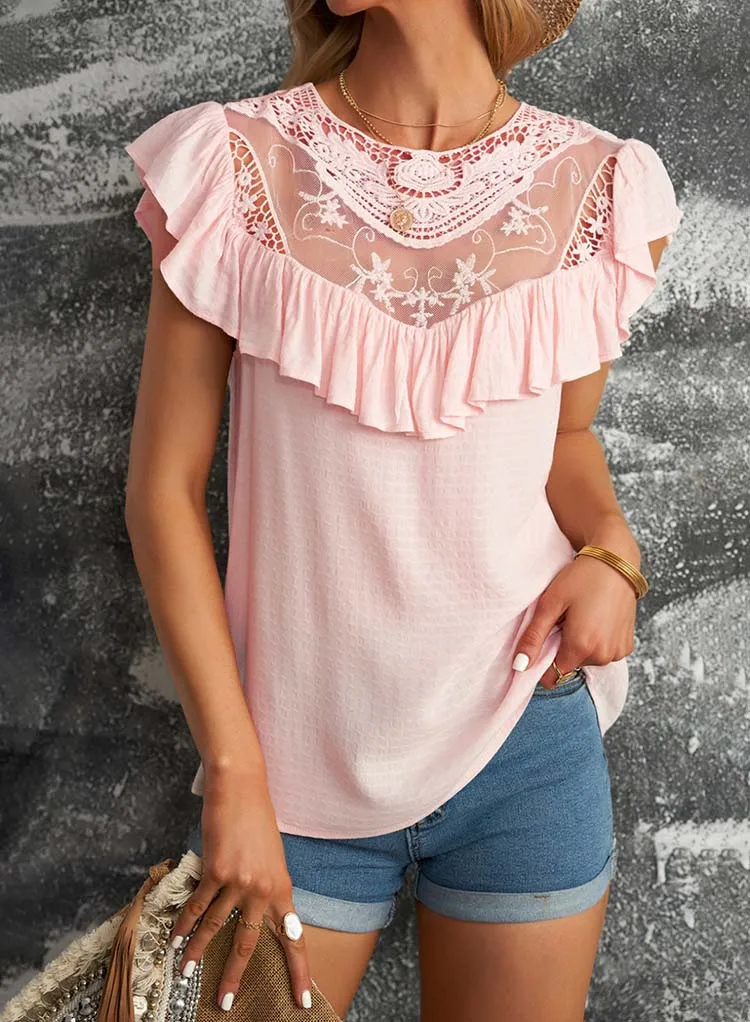 Летняя однотонная блузка с коротким рукавом для женщин, модная, кружевная, с круглым вырезом, элегантная, офисная, для девушек, рубашки, плюс размер, повседневные шифоновые топы