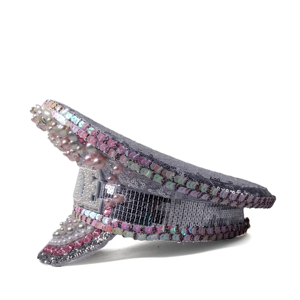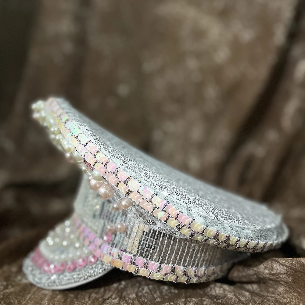 Красивая белая шляпа с блестками, стиль праздничной шляпы с голографической отделкой и стразами.